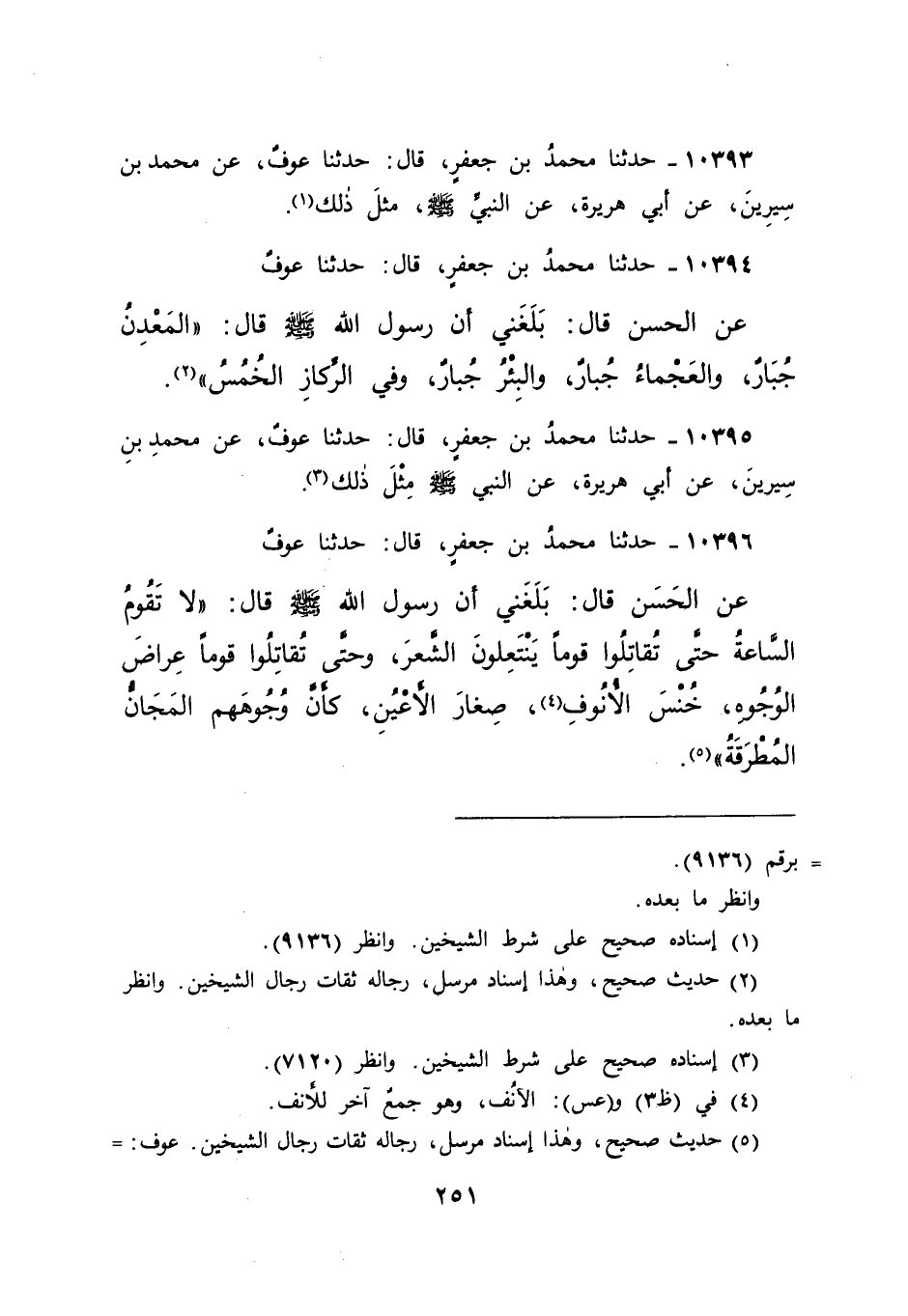 ١٠٣٩٦ - حَدَّثَنَا مُحَمَّدُ بْنُ جَعْفَرٍ، قَالَ: حَدَّثَنَا عَوْفٌ، عَنِ الْحَسَنِ، قَالَ: بَلَغَنِي أَنَّ رَسُولَ اللهِ صَلَّى اللهُ عَلَيْهِ وَسَلَّمَ قَالَ: " لَا تَقُومُ السَّاعَةُ حَتَّى تُقَاتِلُوا قَوْمًا يَنْتَعِلُونَ الشَّعْرَ، وَحَتَّى تُقَاتِلُوا قَوْمًا عِرَاضَ الْوُجُوهِ، خُنْسَ الْأُنُوفِ (٤) ، صِغَارَ الْأَعْيُنِ، كَأَنَّ وُجُوهَهُمُ الْمَجَانُّ الْمُطْرَقَةُ " (٥)