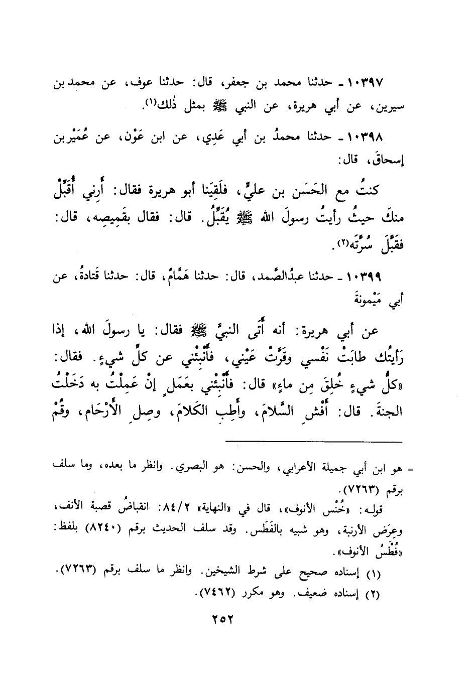 ١٠٣٩٨ - حَدَّثَنَا مُحَمَّدُ بْنُ أَبِي عَدِيٍّ، عَنِ ابْنِ عَوْنٍ، عَنْ عُمَيْرِ بْنِ إِسْحَاقَ، قَالَ: كُنْتُ مَعَ الْحَسَنِ بْنِ عَلِيٍّ فَلَقِيَنَا أَبُو هُرَيْرَةَ فَقَالَ: " أَرِنِي أُقَبِّلْ مِنْكَ حَيْثُ رَأَيْتُ رَسُولَ اللهِ صَلَّى اللهُ عَلَيْهِ وَسَلَّمَ يُقَبِّلُ " قَالَ: فَقَالَ: بِقَمِيصِهِ قَالَ: فَقَبَّلَ سُرَّتَهُ (٢)