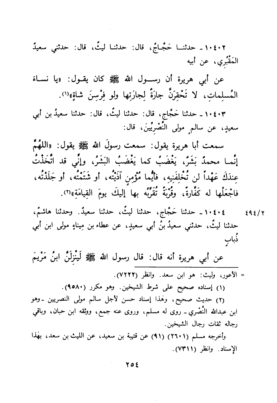 ١٠٤٠٣ - حَدَّثَنَا حَجَّاجٌ، قَالَ: حَدَّثَنَا لَيْثٌ، قَالَ: حَدَّثَنَا سَعِيدُ بْنُ أَبِي سَعِيدٍ، عَنْ سَالِمٍ، مَوْلَى النَّصْرِيِّينَ قَالَ: سَمِعْتُ أَبَا هُرَيْرَةَ، يَقُولُ: سَمِعْتُ رَسُولَ اللهِ صَلَّى اللهُ عَلَيْهِ وَسَلَّمَ يَقُولُ: " اللهُمَّ إِنَّمَا مُحَمَّدٌ بَشَرٌ يَغْضَبُ كَمَا يَغْضَبُ الْبَشَرُ، وَإِنِّي قَدِ اتَّخَذْتُ عِنْدَكَ عَهْدًا لَنْ تُخْلِفَنِيهِ، فَأَيُّمَا مُؤْمِنٍ آذَيْتُهُ، أَوْ شَتَمْتُهُ، أَوْ جَلَدْتُهُ، فَاجْعَلْهَا لَهُ كَفَّارَةً، وَقُرْبَةً تُقَرِّبُهُ بِهَا إِلَيْكَ يَوْمَ الْقِيَامَةِ " (٢)