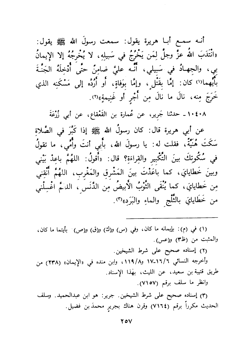 ١٠٤٠٨ - حَدَّثَنَا جَرِيرٌ، عَنْ عُمَارَةَ بْنِ الْقَعْقَاعِ، عَنْ أَبِي زُرْعَةَ، عَنْ أَبِي هُرَيْرَةَ، قَالَ كَانَ رَسُولُ اللهِ صَلَّى اللهُ عَلَيْهِ وَسَلَّمَ إِذَا كَبَّرَ فِي الصَّلَاةِ سَكَتَ هُنَيَّةً، فَقُلْتُ لَهُ: يَا رَسُولَ اللهِ، بِأَبِي أَنْتَ وَأُمِّي، مَا تَقُولُ فِي سُكُوتِكَ بَيْنَ التَّكْبِيرِ وَالْقِرَاءَةِ؟ قَالَ: " أَقُولُ: اللهُمَّ بَاعِدْ بَيْنِي وَبَيْنَ خَطَايَايَ، كَمَا بَاعَدْتَ بَيْنَ الْمَشْرِقِ وَالْمَغْرِبِ، اللهُمَّ أَنْقِنِي مِنْ خَطَايَايَ، كَمَا يُنَقَّى الثَّوْبُ الْأَبْيَضُ مِنَ الدَّنَسِ، اللهُمَّ اغْسِلْنِي مِنْ خَطَايَايَ بِالثَّلْجِ وَالْمَاءِ وَالْبَرَدِ " (٣)