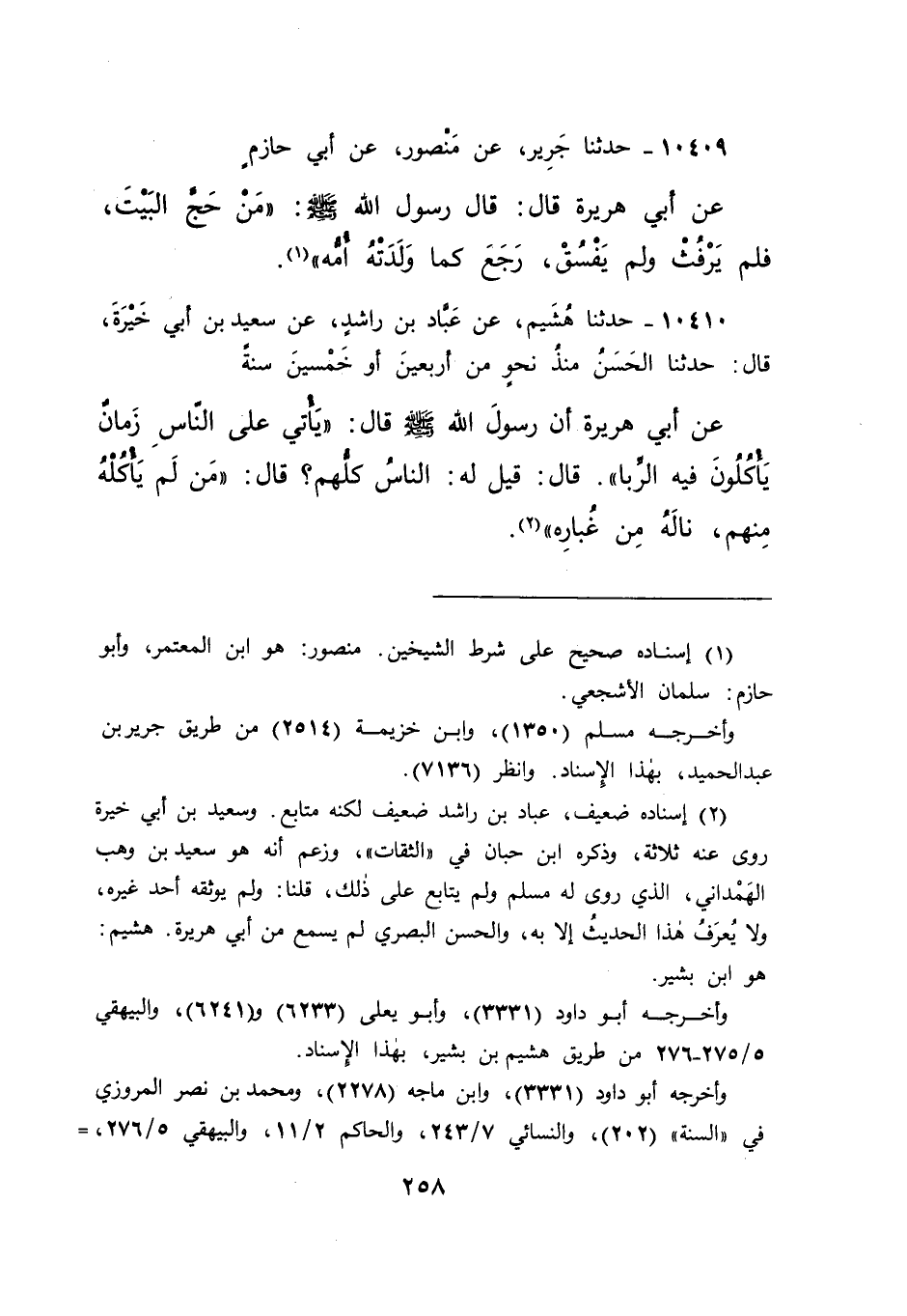 ١٠٤١٠ - حَدَّثَنَا هُشَيْمٌ، عَنْ عَبَّادِ بْنِ رَاشِدٍ، عَنْ سَعِيدِ بْنِ أَبِي خَيْرَةَ، قَالَ: حَدَّثَنَا الْحَسَنُ، مُنْذُ نَحْوٍ مِنْ أَرْبَعِينَ أَوْ خَمْسِينَ سَنَةً عَنْ أَبِي هُرَيْرَةَ أَنَّ رَسُولَ اللهِ صَلَّى اللهُ عَلَيْهِ وَسَلَّمَ قَالَ: " يَأْتِي عَلَى النَّاسِ زَمَانٌ يَأْكُلُونَ فِيهِ الرِّبَا "، قَالَ: قِيلَ لَهُ: النَّاسُ كُلُّهُمْ؟ قَالَ: " مَنْ لَمْ يَأْكُلْهُ مِنْهُمْ، نَالَهُ مِنْ غُبَارِهِ " (٢)