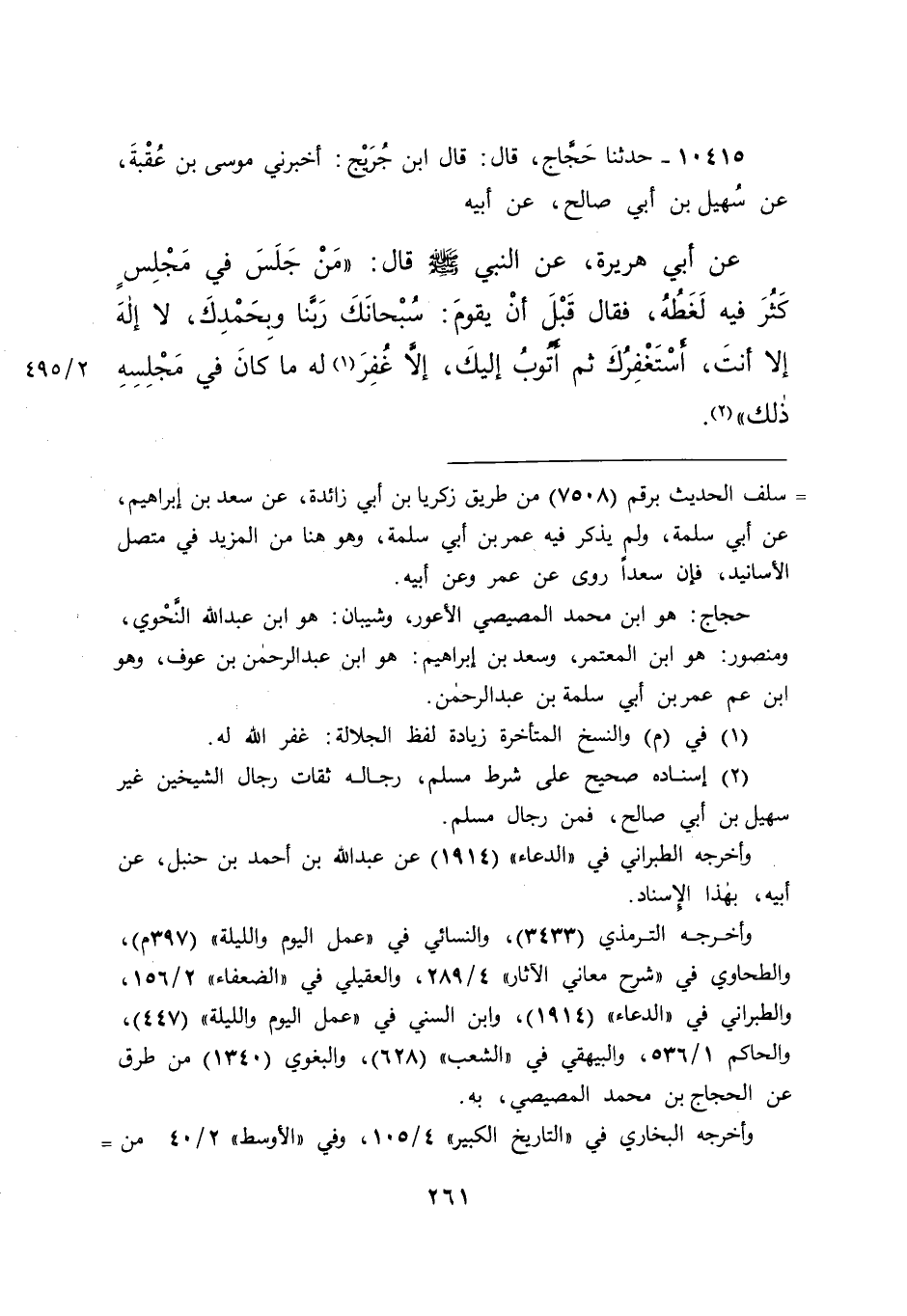 ١٠٤١٥ - حَدَّثَنَا حَجَّاجٌ، قَالَ: قَالَ ابْنُ جُرَيْجٍ، أَخْبَرَنِي مُوسَى بْنُ عُقْبَةَ، عَنْ سُهَيْلِ بْنِ أَبِي صَالِحٍ، عَنْ أَبِيهِ، عَنْ أَبِي هُرَيْرَةَ، عَنِ النَّبِيِّ صَلَّى اللهُ عَلَيْهِ وَسَلَّمَ قَالَ: " مَنْ جَلَسَ فِي مَجْلِسٍ كَثُرَ فِيهِ لَغَطُهُ فَقَالَ قَبْلَ أَنْ يَقُومَ: سُبْحَانَكَ رَبَّنَا وَبِحَمْدِكَ، لَا إِلَهَ إِلَّا أَنْتَ، أَسْتَغْفِرُكَ ثُمَّ أَتُوبُ إِلَيْكَ، إِلَّا غَفَرَ (١) اللهُ لَهُ مَا كَانَ فِي مَجْلِسِهِ ذَلِكَ " (٢)