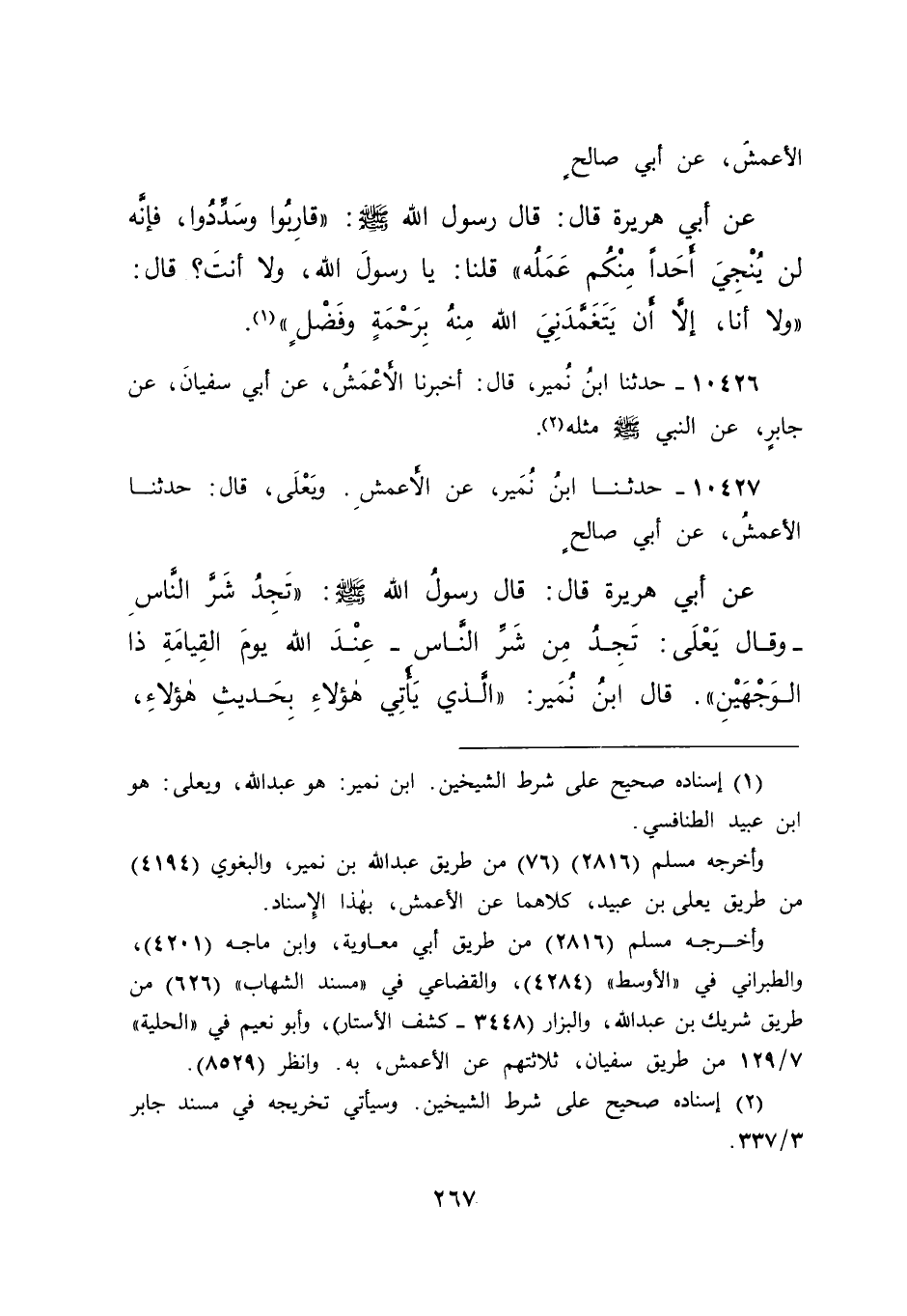 ١٠٤٢٧ - حَدَّثَنَا ابْنُ نُمَيْرٍ، عَنِ الْأَعْمَشِ، وَيَعْلَى، قَالَ: حَدَّثَنَا الْأَعْمَشُ، عَنْ أَبِي صَالِحٍ، عَنْ أَبِي هُرَيْرَةَ، قَالَ: قَالَ رَسُولُ اللهِ صَلَّى اللهُ عَلَيْهِ وَسَلَّمَ: " تَجِدُ شَرَّ النَّاسِ - وَقَالَ: يَعْلَى تَجِدُ مِنْ شَرِّ النَّاسِ - عِنْدَ اللهِ يَوْمَ الْقِيَامَةِ ذَا الْوَجْهَيْنِ " قَالَ ابْنُ نُمَيْرٍ: الَّذِي يَأْتِي هَؤُلَاءِ بِحَدِيثِ هَؤُلَاءِ