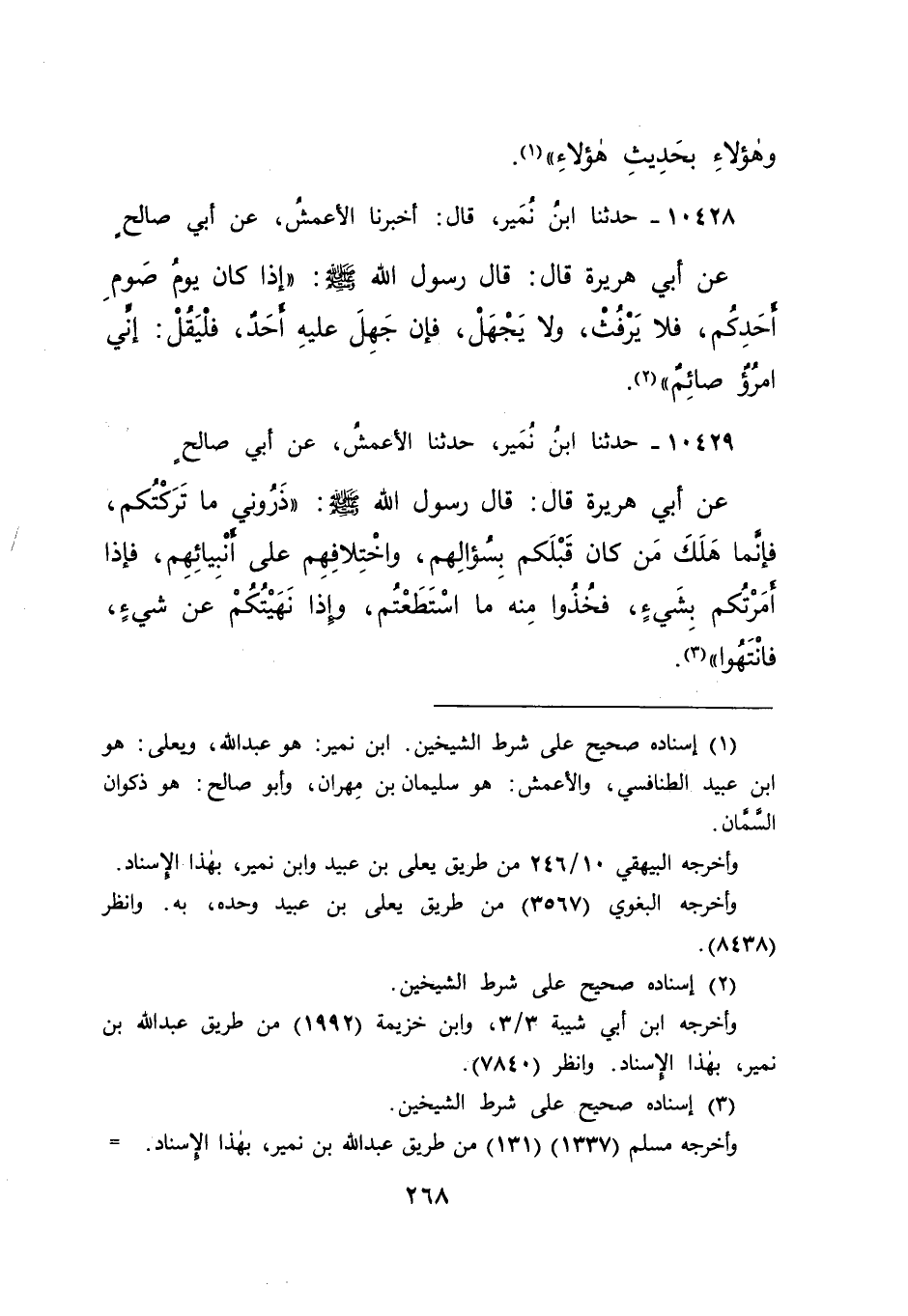 ١٠٤٢٩ - حَدَّثَنَا ابْنُ نُمَيْرٍ، حَدَّثَنَا الْأَعْمَشُ، عَنْ أَبِي صَالِحٍ، عَنْ أَبِي هُرَيْرَةَ قَالَ: قَالَ رَسُولُ اللهِ صَلَّى اللهُ عَلَيْهِ وَسَلَّمَ: " ذَرُونِي مَا تَرَكْتُكُمْ، فَإِنَّمَا هَلَكَ مَنْ كَانَ قَبْلَكُمْ بِسُؤَالِهِمْ، وَاخْتِلَافِهِمْ عَلَى أَنْبِيَائِهِمْ، فَإِذَا أَمَرْتُكُمْ بِشَيْءٍ، فَخُذُوا مِنْهُ مَا اسْتَطَعْتُمْ، وَإِذَا نَهَيْتُكُمْ عَنْ شَيْءٍ، فَانْتَهُوا " (٣)