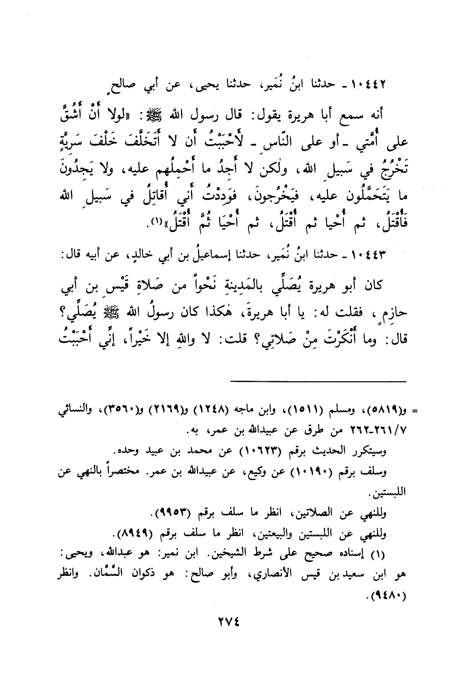 ١٠٤٤٢ - حَدَّثَنَا ابْنُ نُمَيْرٍ، حَدَّثَنَا يَحْيَى، عَنْ أَبِي صَالِحٍ، أَنَّهُ سَمِعَ أَبَا هُرَيْرَةَ، يَقُولُ: قَالَ رَسُولُ اللهِ صَلَّى اللهُ عَلَيْهِ وَسَلَّمَ: " لَوْلَا أَنْ أَشُقَّ عَلَى أُمَّتِي - أَوْ عَلَى النَّاسِ - لَأَحْبَبْتُ أَنْ لَا أَتَخَلَّفَ خَلْفَ سَرِيَّةٍ تَخْرُجُ فِي سَبِيلِ اللهِ، وَلَكِنْ لَا أَجِدُ مَا أَحْمِلُهُمْ عَلَيْهِ، وَلَا يَجِدُونَ مَا يَتَحَمَّلُونَ عَلَيْهِ، فَيَخْرُجُونَ، فَوَدِدْتُ أَنْ أُقَاتِلَ فِي سَبِيلِ اللهِ فَأُقْتَلَ، ثُمَّ أُحْيَا ثُمَّ أُقْتَلَ، ثُمَّ أُحْيَا ثُمَّ أُقْتَلَ " (١)