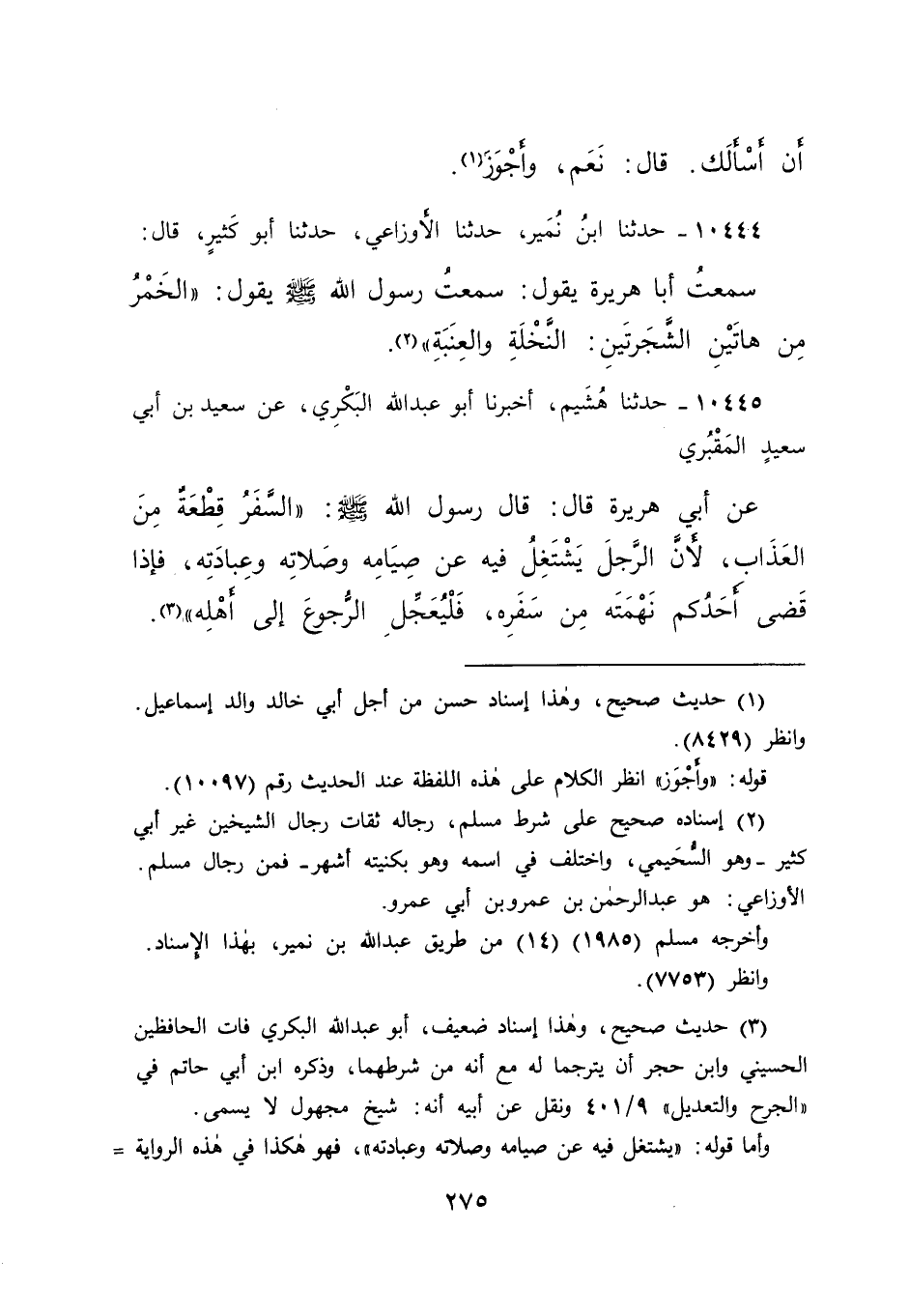 ١٠٤٤٥ - حَدَّثَنَا هُشَيْمٌ، أَخْبَرَنَا أَبُو عَبْدِ اللهِ الْبَكْرِيُّ، عَنْ سَعِيدِ بْنِ أَبِي سَعِيدٍ الْمَقْبُرِيِّ، عَنْ أَبِي هُرَيْرَةَ، قَالَ: قَالَ رَسُولُ اللهِ صَلَّى اللهُ عَلَيْهِ وَسَلَّمَ: " السَّفَرُ قِطْعَةٌ مِنَ الْعَذَابِ، لِأَنَّ الرَّجُلَ يَشْتَغِلُ فِيهِ عَنْ صِيَامِهِ وَصَلَاتِهِ وَعِبَادَتِهِ، فَإِذَا قَضَى أَحَدُكُمْ نَهْمَتَهُ مِنْ سَفَرِهِ، فَلْيُعَجِّلِ الرُّجُوعَ إِلَى أَهْلِهِ " (٣)