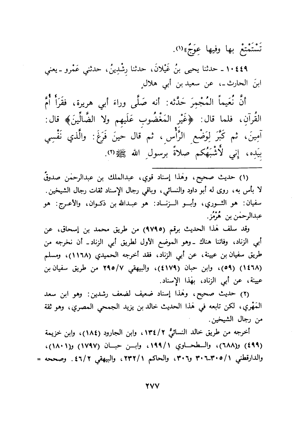 ١٠٤٤٩ - حَدَّثَنَا يَحْيَى بْنُ غَيْلَانَ، حَدَّثَنَا رِشْدِينُ، حَدَّثَنِي عَمْرٌو يَعْنِي ابْنَ الْحَارِثِ، عَنْ سَعِيدِ بْنِ أَبِي هِلَالٍ، أَنَّ نُعَيْمًا الْمُجْمِرَ، حَدَّثَهُ أَنَّهُ، صَلَّى وَرَاءَ أَبِي هُرَيْرَةَ " فَقَرَأَ أُمَّ الْقُرْآنِ فَلَمَّا قَالَ: {غَيْرِ الْمَغْضُوبِ عَلَيْهِمْ وَلَا الضَّالِّينَ} [الفاتحة: ٧] قَالَ: آمِينَ، ثُمَّ كَبَّرَ لِوَضْعِ الرَّأْسِ "، ثُمَّ قَالَ حِينَ فَرَغَ: وَالَّذِي نَفْسِي بِيَدِهِ، إِنِّي لَأَشْبَهُكُمْ صَلَاةً بِرَسُولِ اللهِ صَلَّى اللهُ عَلَيْهِ وَسَلَّمَ (٢)