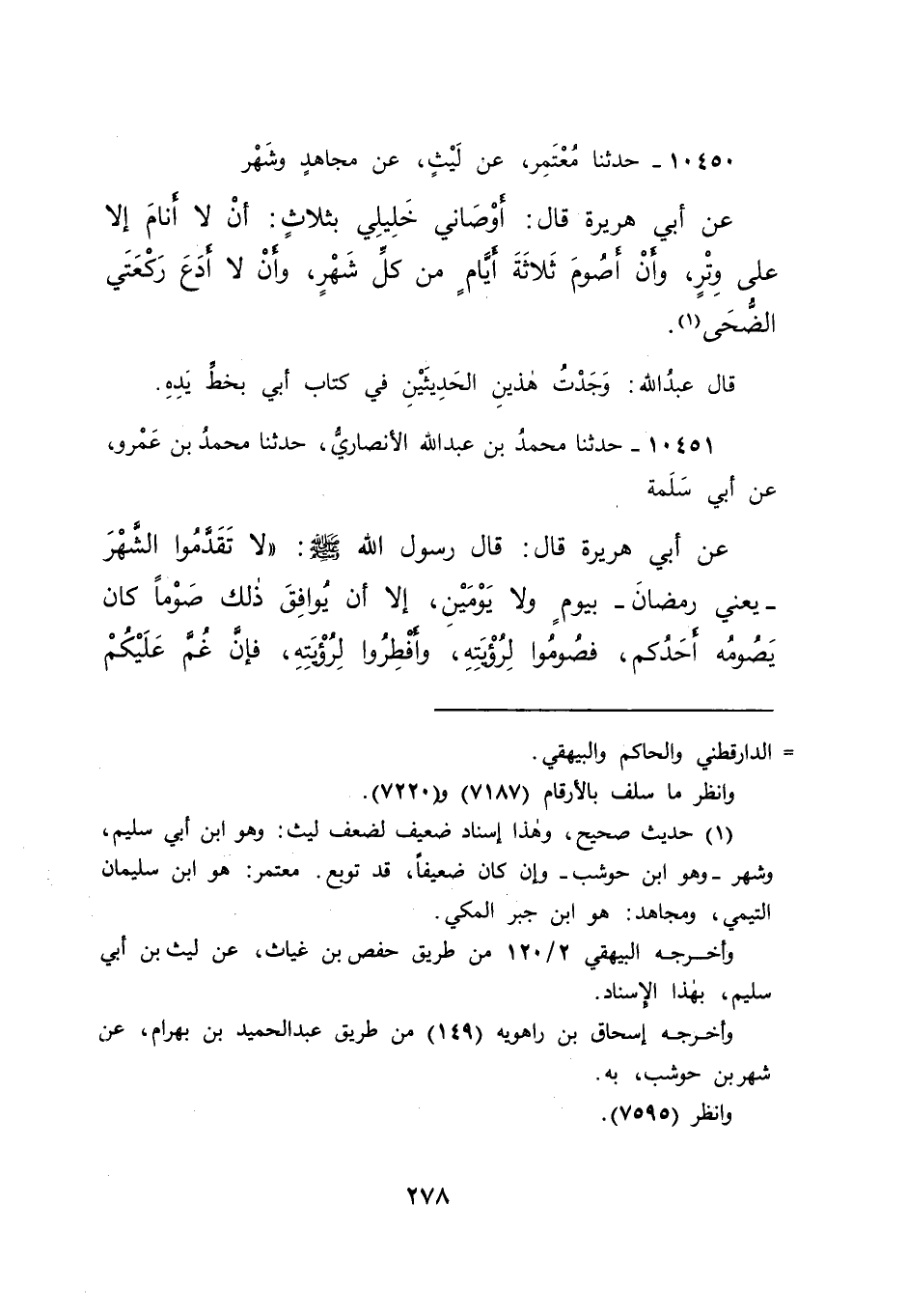 ١٠٤٥١ - حَدَّثَنَا مُحَمَّدُ بْنُ عَبْدِ اللهِ الْأَنْصَارِيُّ، حَدَّثَنَا مُحَمَّدُ بْنُ عَمْرٍو، عَنْ أَبِي سَلَمَةَ، عَنْ أَبِي هُرَيْرَةَ قَالَ: قَالَ رَسُولُ اللهِ صَلَّى اللهُ عَلَيْهِ وَسَلَّمَ: " لَا تَقَدَّمُوا الشَّهْرَ - يَعْنِي رَمَضَانَ - بِيَوْمٍ وَلَا يَوْمَيْنِ، إِلَّا أَنْ يُوَافِقَ ذَلِكَ صَوْمًا كَانَ يَصُومُهُ أَحَدُكُمْ، فَصُومُوا لِرُؤْيَتِهِ، وَأَفْطِرُوا لِرُؤْيَتِهِ، فَإِنْ غُمَّ عَلَيْكُمْ