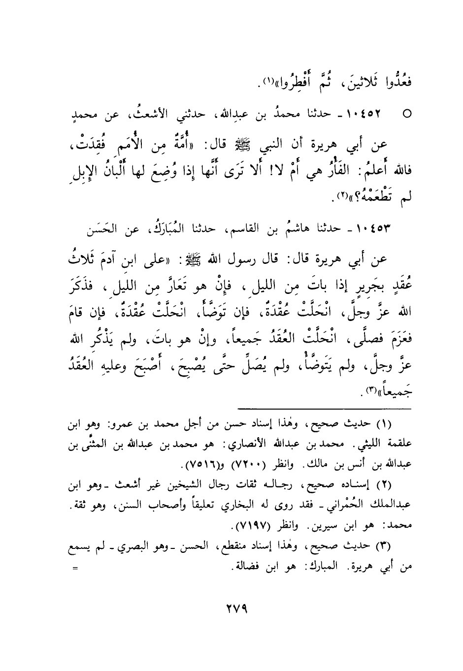 ١٠٤٥٣ - حَدَّثَنَا هَاشِمُ بْنُ الْقَاسِمِ، حَدَّثَنَا الْمُبَارَكُ، عَنِ الْحَسَنِ، عَنْ أَبِي هُرَيْرَةَ، قَالَ: قَالَ رَسُولُ اللهِ صَلَّى اللهُ عَلَيْهِ وَسَلَّمَ: عَلَى ابْنِ آدَمَ ثَلَاثُ عُقَدٍ بِجَرِيرٍ إِذَا بَاتَ مِنَ اللَّيْلِ، فَإِنْ هُوَ تَعَارَّ مِنَ اللَّيْلِ، فَذَكَرَ اللهَ عَزَّ وَجَلَّ، انْحَلَّتْ عُقْدَةٌ، فَإِنْ تَوَضَّأَ، انْحَلَّتْ عُقْدَةٌ، فَإِنْ قَامَ فَعَزَمَ فَصَلَّى، انْحَلَّتِ الْعُقَدُ جَمِيعًا، وَإِنْ هُوَ بَاتَ، وَلَمْ يَذْكُرِ اللهَ عَزَّ وَجَلَّ، وَلَمْ يَتَوَضَّأْ، وَلَمْ يُصَلِّ حَتَّى يُصْبِحَ، أَصْبَحَ وَعَلَيْهِ الْعُقَدُ جَمِيعًا " (٣)