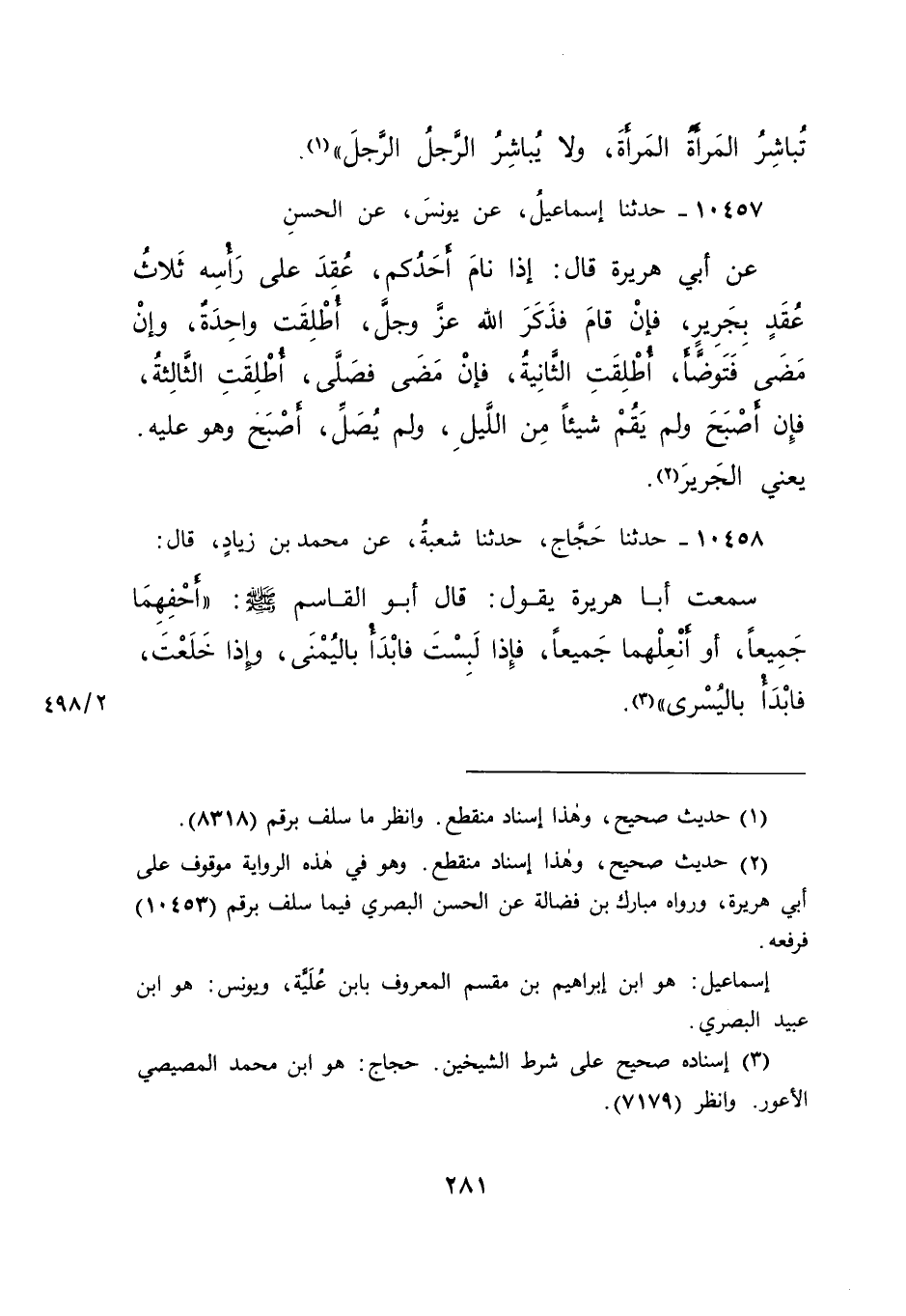 ١٠٤٥٧ - حَدَّثَنَا إِسْمَاعِيلُ، عَنْ يُونُسَ، عَنِ الْحَسَنِ، عَنْ أَبِي هُرَيْرَةَ، قَالَ: " إِذَا نَامَ أَحَدُكُمْ عُقِدَ عَلَى رَأْسِهِ ثَلَاثُ عُقَدٍ بِجَرِيرٍ، فَإِنْ قَامَ فَذَكَرَ اللهَ عَزَّ وَجَلَّ، أُطْلِقَتْ وَاحِدَةٌ، وَإِنْ مَضَى فَتَوَضَّأَ، أُطْلِقَتِ الثَّانِيَةُ، فَإِنْ مَضَى فَصَلَّى، أُطْلِقَتِ الثَّالِثَةُ، فَإِنْ أَصْبَحَ وَلَمْ يَقُمْ شَيْئًا مِنَ اللَّيْلِ، وَلَمْ يُصَلِّ، أَصْبَحَ وَهُوَ عَلَيْهِ يَعْنِي الْجَرِيرَ" (٢)