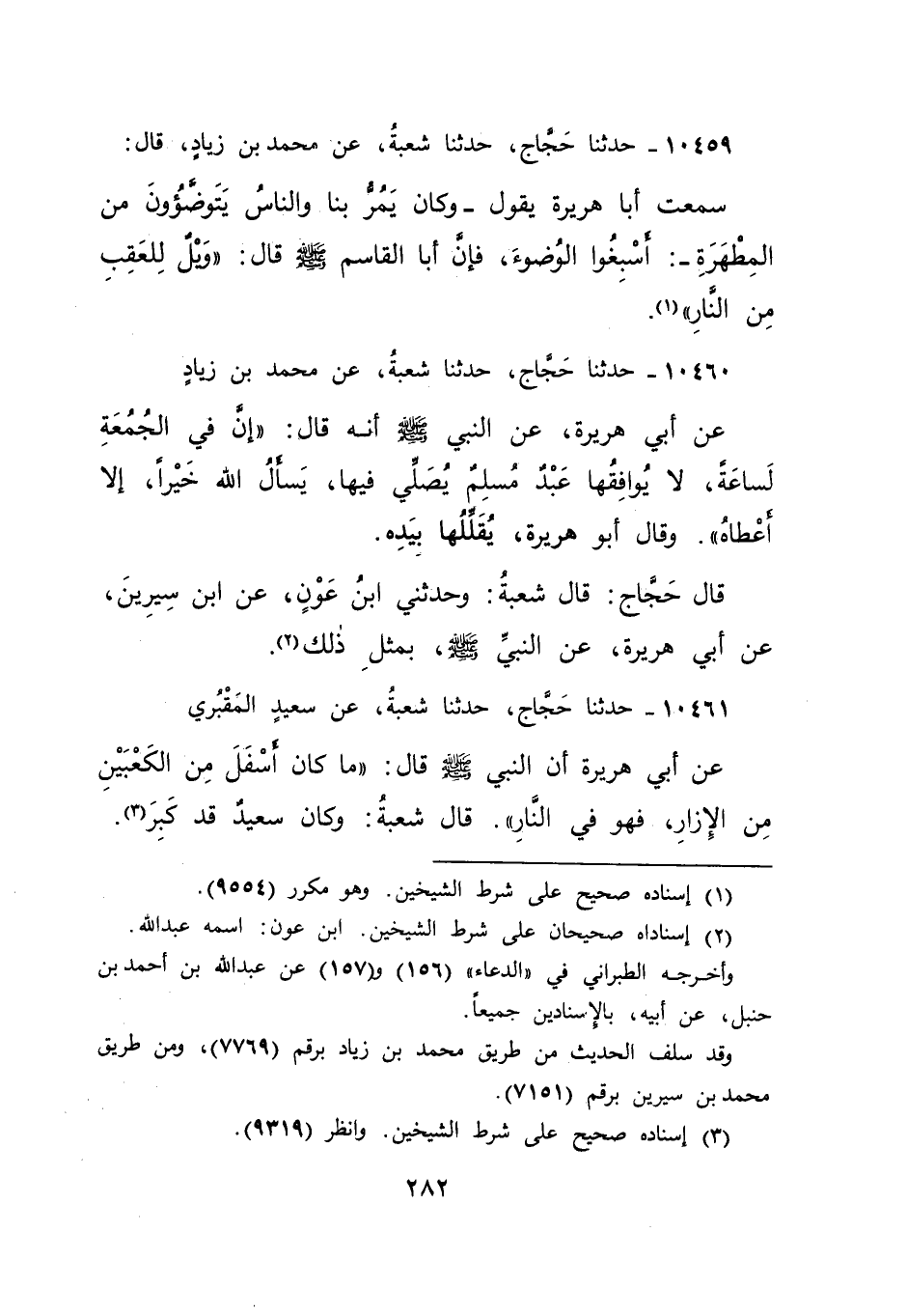 ١٠٤٥٩ - حَدَّثَنَا حَجَّاجٌ، حَدَّثَنَا شُعْبَةُ، عَنْ مُحَمَّدِ بْنِ زِيَادٍ، قَالَ: سَمِعْتُ أَبَا هُرَيْرَةَ، يَقُولُ: وَكَانَ يَمُرُّ بِنَا وَالنَّاسُ يَتَوَضَّئُونَ مِنَ الْمَطْهَرَةِ أَسْبِغُوا الْوُضُوءَ فَإِنَّ أَبَا الْقَاسِمِ صَلَّى اللهُ عَلَيْهِ وَسَلَّمَ قَالَ: " وَيْلٌ لِلْعَقِبِ مِنَ النَّارِ " (١)