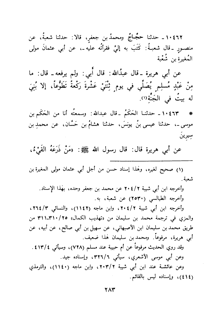 ١٠٤٦٢ - حَدَّثَنَا حَجَّاجٌ، وَمُحَمَّدُ بْنُ جَعْفَرٍ، قَالَا: حَدَّثَنَا شُعْبَةُ، عَنْ مَنْصُورٍ، قَالَ شُعْبَةُ: كَتَبَ بِهِ إِلَيَّ فَقَرَأْتُهُ عَلَيْهِ عَنْ أَبِي عُثْمَانَ مَوْلَى الْمُغِيرَةِ بْنِ شُعْبَةَ، عَنْ أَبِي هُرَيْرَةَ، قَالَ عَبْدُ اللهِ: قَالَ أَبِي وَلَمْ يَرْفَعْهُ: قَالَ: " مَا مِنْ عَبْدٍ مُسْلِمٍ يُصَلِّي فِي يَوْمٍ ثِنْتَيْ عَشْرَةَ رَكْعَةً تَطَوُّعًا، إِلَّا بُنِيَ لَهُ بَيْتٌ فِي الْجَنَّةِ " (١)