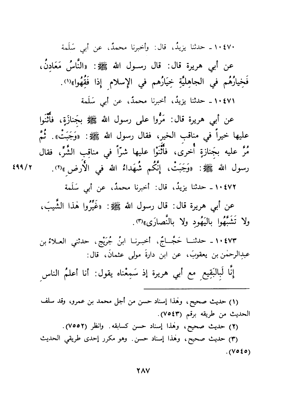 ١٠٤٧١ - حَدَّثَنَا يَزِيدُ، أَخْبَرَنَا مُحَمَّدٌ، عَنْ أَبِي سَلَمَةَ، عَنْ أَبِي هُرَيْرَةَ، قَالَ: مَرُّوا عَلَى رَسُولِ اللهِ صَلَّى اللهُ عَلَيْهِ وَسَلَّمَ بِجِنَازَةٍ، فَأَثْنَوْا عَلَيْهَا خَيْرًا فِي مَنَاقِبِ الْخَيْرِ، فَقَالَ رَسُولُ اللهِ صَلَّى اللهُ عَلَيْهِ وَسَلَّمَ: " وَجَبَتْ ". ثُمَّ مَرُّوا عَلَيْهِ بِجِنَازَةٍ أُخْرَى، فَأَثْنَوْا عَلَيْهَا شَرًّا فِي مَنَاقِبِ الشَّرِّ، فَقَالَ رَسُولُ اللهِ صَلَّى اللهُ عَلَيْهِ وَسَلَّمَ: " وَجَبَتْ، إِنَّكُمْ شُهَدَاءُ اللهِ فِي الْأَرْضِ " (٢)
