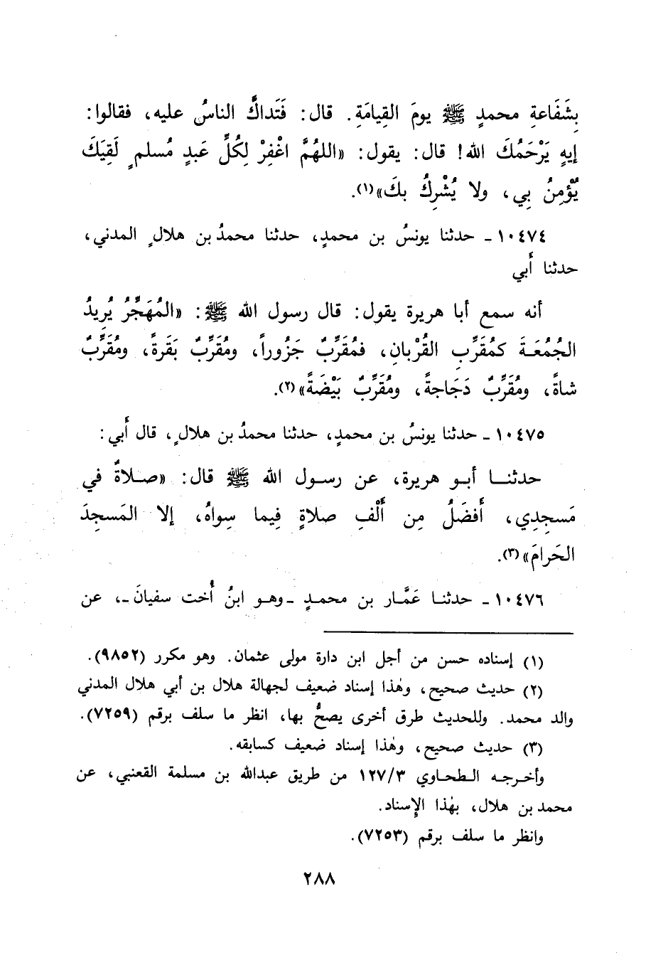 ١٠٤٧٥ - حَدَّثَنَا يُونُسُ بْنُ مُحَمَّدٍ، حَدَّثَنَا مُحَمَّدُ بْنُ هِلَالٍ، قَالَ: أَبِي حَدَّثَنَا أَبُو هُرَيْرَةَ، عَنْ رَسُولِ اللهِ صَلَّى اللهُ عَلَيْهِ وَسَلَّمَ قَالَ: " صَلَاةٌ فِي مَسْجِدِي أَفْضَلُ مِنْ أَلْفِ صَلَاةٍ فِيمَا سِوَاهُ، إِلَّا الْمَسْجِدَ الْحَرَامَ " (٣)