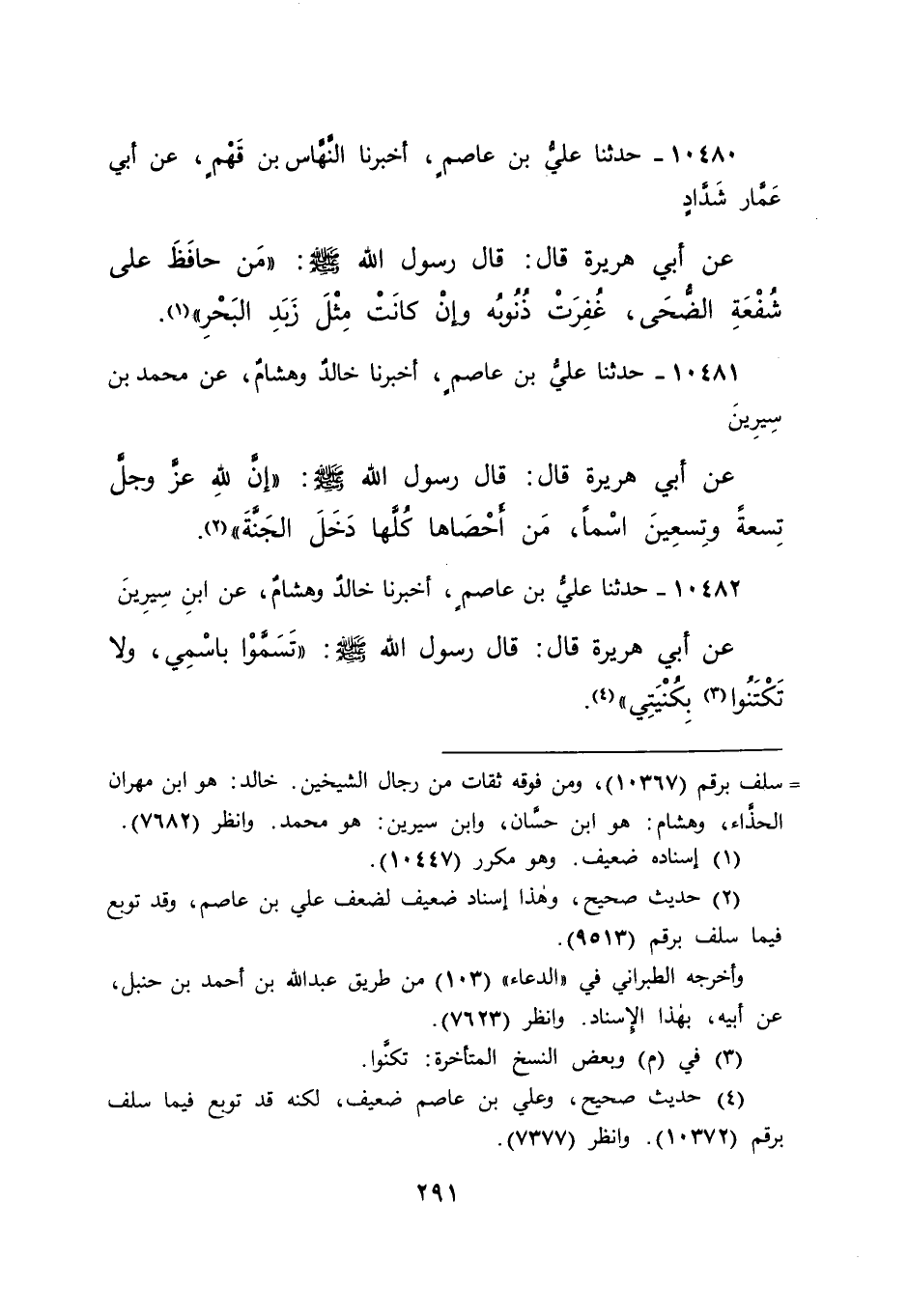 ١٠٤٨١ - حَدَّثَنَا عَلِيُّ بْنُ عَاصِمٍ، أَخْبَرَنَا خَالِدٌ، وَهِشَامٌ، عَنْ مُحَمَّدِ بْنِ سِيرِينَ، عَنْ أَبِي هُرَيْرَةَ، قَالَ: قَالَ رَسُولُ اللهِ صَلَّى اللهُ عَلَيْهِ وَسَلَّمَ: " إِنَّ لِلَّهِ عَزَّ وَجَلَّ تِسْعَةً وَتِسْعِينَ اسْمًا، مَنْ أَحْصَاهَا كُلَّهَا دَخَلَ الْجَنَّةَ " (٢)