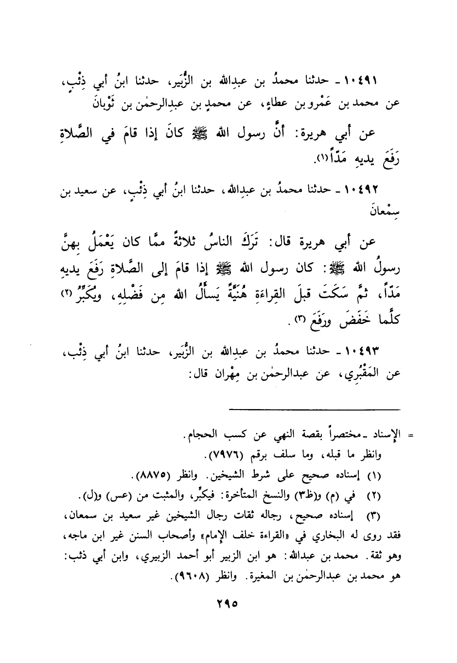 ١٠٤٩١ - حَدَّثَنَا مُحَمَّدُ بْنُ عَبْدِ اللهِ بْنِ الزُّبَيْرِ، حَدَّثَنَا ابْنُ أَبِي ذِئْبٍ، عَنْ مُحَمَّدِ بْنِ عَمْرِو بْنِ عَطَاءٍ، عَنْ مُحَمَّدِ بْنِ عَبْدِ الرَّحْمَنِ بْنِ ثَوْبَانَ، عَنْ أَبِي هُرَيْرَةَ، أَنَّ رَسُولَ اللهِ صَلَّى اللهُ عَلَيْهِ وَسَلَّمَ كَانَ " إِذَا قَامَ فِي الصَّلَاةِ رَفَعَ يَدَيْهِ مَدًّا " (١)