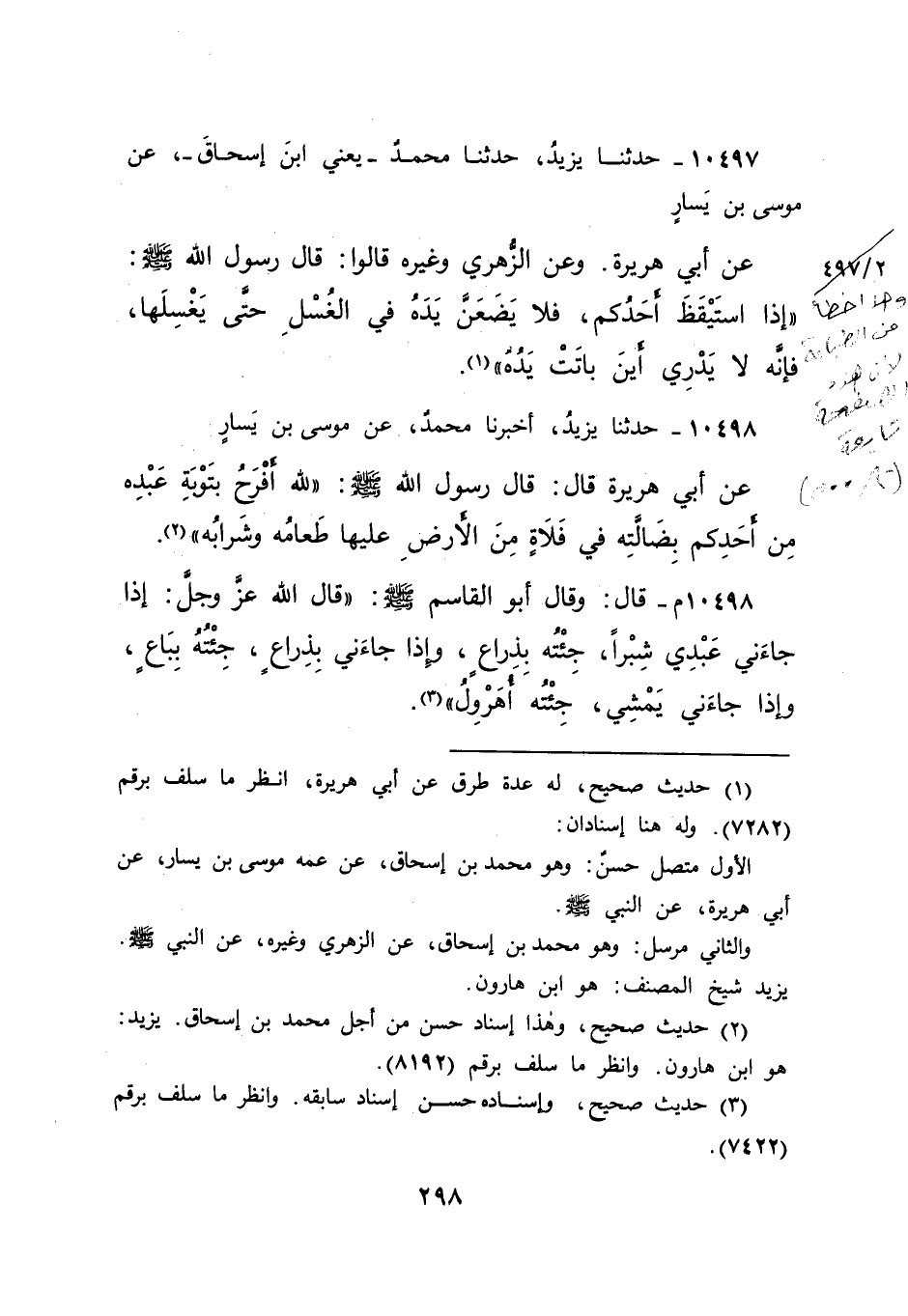 الأول متصل حسن: وهو محمد بن إسحاق، عن عمه موسى بن يسار، عن أبي هريرة، عن النبي صَلَّى اللهُ عَلَيْهِ وَسَلَّمَ.