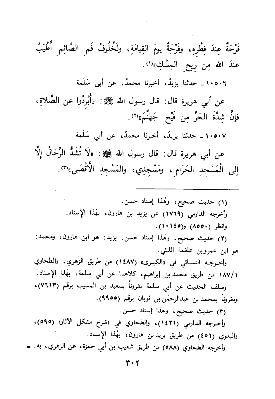 ١٠٥٠٧ - حَدَّثَنَا يَزِيدُ، أَخْبَرَنَا مُحَمَّدٌ، عَنْ أَبِي سَلَمَةَ، عَنْ أَبِي هُرَيْرَةَ، قَالَ: قَالَ رَسُولُ اللهِ صَلَّى اللهُ عَلَيْهِ وَسَلَّمَ: " لَا تُشَدُّ الرِّحَالُ إِلَّا إِلَى الْمَسْجِدِ الْحَرَامِ، وَمَسْجِدِي، وَالْمَسْجِدِ الْأَقْصَى " (٣)