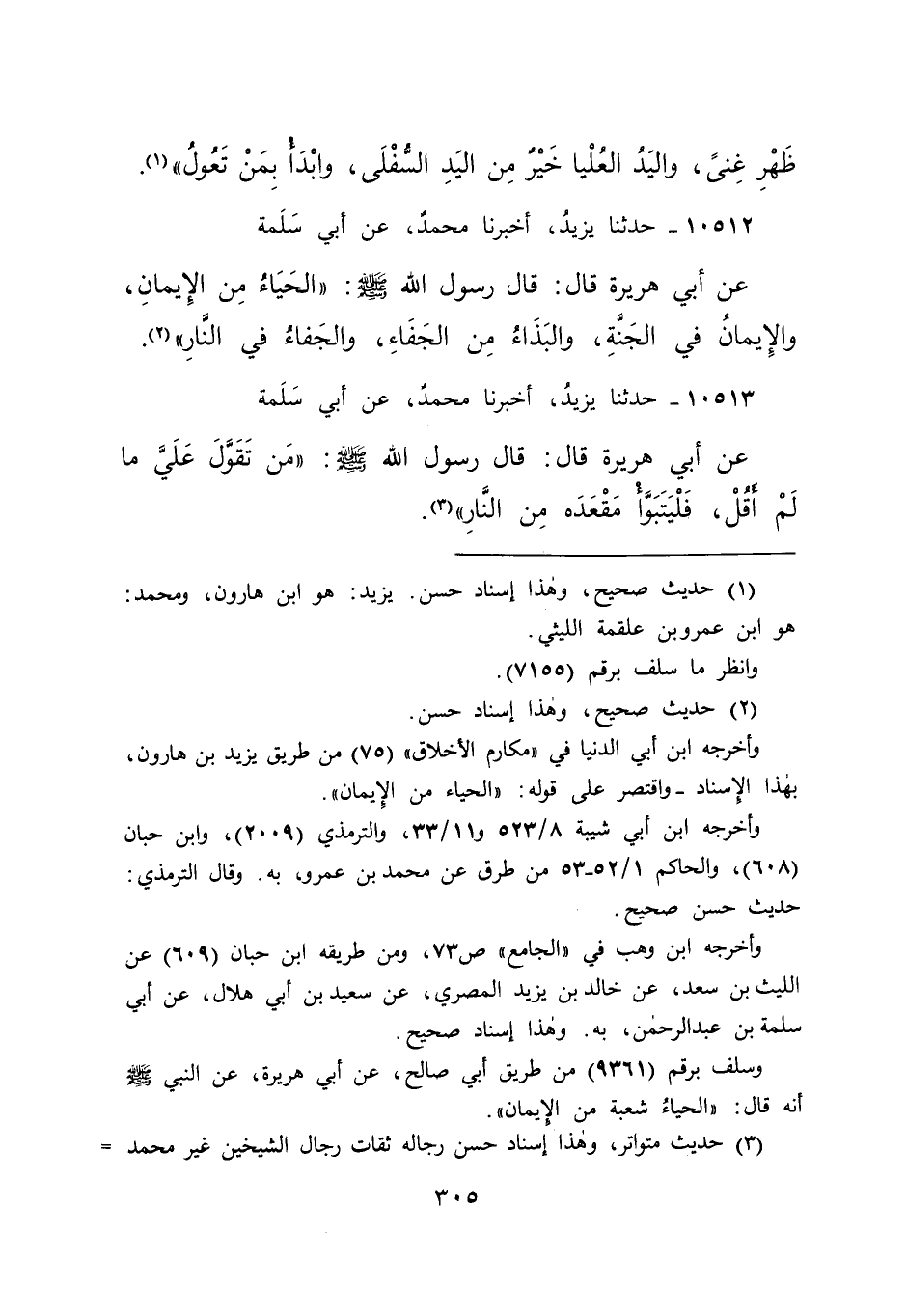 ١٠٥١٢ - حَدَّثَنَا يَزِيدُ، أَخْبَرَنَا مُحَمَّدٌ، عَنْ أَبِي سَلَمَةَ، عَنْ أَبِي هُرَيْرَةَ، قَالَ: قَالَ رَسُولُ اللهِ صَلَّى اللهُ عَلَيْهِ وَسَلَّمَ: " الْحَيَاءُ مِنَ الْإِيمَانِ، وَالْإِيمَانُ فِي الْجَنَّةِ، وَالْبَذَاءُ مِنَ الْجَفَاءِ، وَالْجَفَاءُ فِي النَّارِ " (٢)