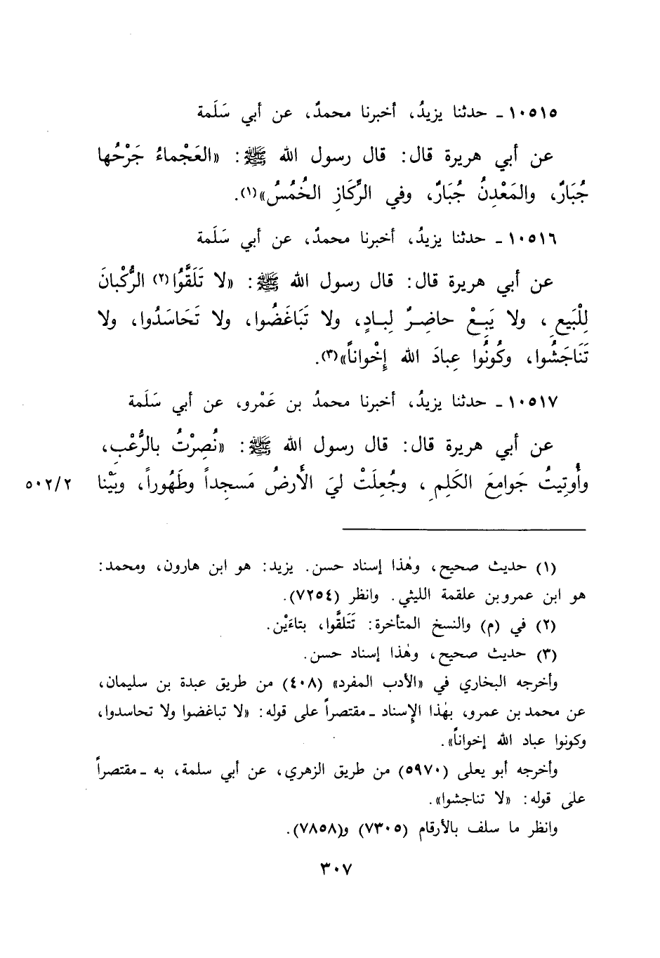 ١٠٥١٦ - حَدَّثَنَا يَزِيدُ، أَخْبَرَنَا مُحَمَّدٌ، عَنْ أَبِي سَلَمَةَ، عَنْ أَبِي هُرَيْرَةَ، قَالَ: قَالَ رَسُولُ اللهِ صَلَّى اللهُ عَلَيْهِ وَسَلَّمَ: " لَا تَلَقَّوُا (٢) الرُّكْبَانَ لِلْبَيْعِ، وَلَا يَبِعْ حَاضِرٌ لِبَادٍ، وَلَا تَبَاغَضُوا، وَلَا تَحَاسَدُوا، وَلَا تَنَاجَشُوا، وَكُونُوا عِبَادَ اللهِ إِخْوَانًا " (٣)