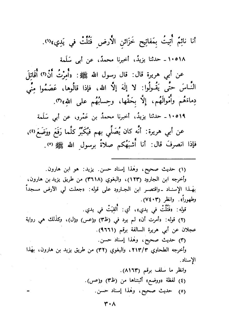 ١٠٥١٨ - حَدَّثَنَا يَزِيدُ، أَخْبَرَنَا مُحَمَّدٌ، عَنْ أَبِي سَلَمَةَ، عَنْ أَبِي هُرَيْرَةَ، قَالَ: قَالَ رَسُولُ اللهِ صَلَّى اللهُ عَلَيْهِ وَسَلَّمَ: " أُمِرْتُ أَنْ (٢) أُقَاتِلَ النَّاسَ حَتَّى يَقُولُوا: لَا إِلَهَ إِلَّا اللهُ، فَإِذَا قَالُوهَا، عَصَمُوا مِنِّي دِمَاءَهُمْ وَأَمْوَالَهُمْ، إِلَّا بِحَقِّهَا، وَحِسَابُهُمْ عَلَى اللهِ " (٣)