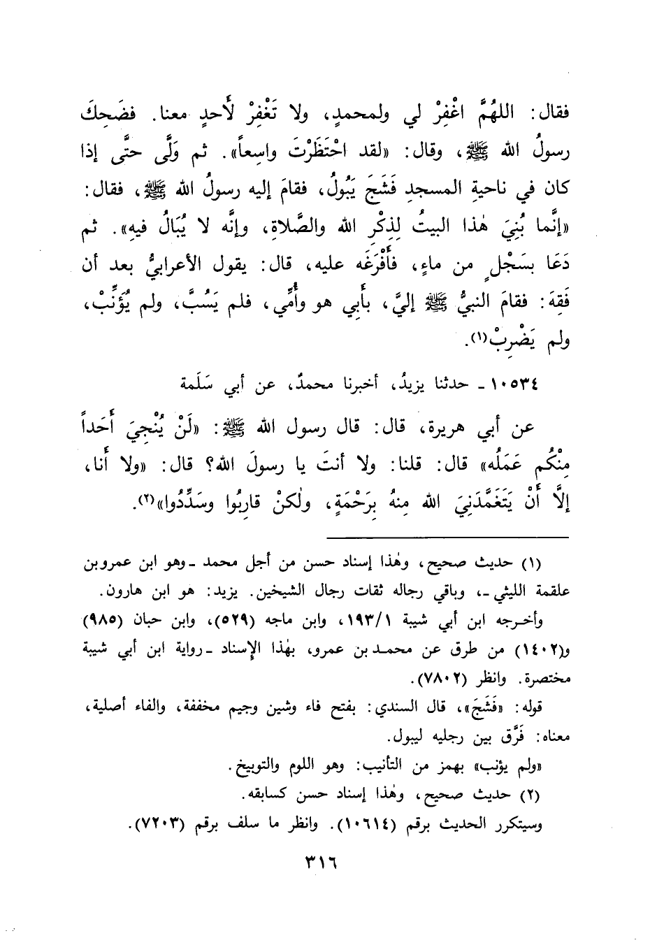 فَقَالَ: اللهُمَّ اغْفِرْ لِي وَلِمُحَمَّدٍ وَلَا تَغْفِرْ لِأَحَدٍ مَعَنَا. فَضَحِكَ رَسُولُ اللهِ صَلَّى اللهُ عَلَيْهِ وَسَلَّمَ، وَقَالَ: " لَقَدِ احْتَظَرْتَ وَاسِعًا ". ثُمَّ وَلَّى حَتَّى إِذَا كَانَ فِي نَاحِيَةِ الْمَسْجِدِ فَشَجَ يَبُولُ، فَقَامَ إِلَيْهِ رَسُولُ اللهِ صَلَّى اللهُ عَلَيْهِ وَسَلَّمَ، فَقَالَ: " إِنَّمَا بُنِيَ هَذَا الْبَيْتُ لِذِكْرِ اللهِ وَالصَّلَاةِ، وَإِنَّهُ لَا يُبَالُ فِيهِ ". ثُمَّ دَعَا بِسَجْلٍ مِنْ مَاءٍ، فَأَفْرَغَهُ عَلَيْهِ، قَالَ: يَقُولُ الْأَعْرَابِيُّ بَعْدَ أَنْ فَقِهَ: فَقَامَ النَّبِيُّ صَلَّى اللهُ عَلَيْهِ وَسَلَّمَ إِلَيَّ، بِأَبِي هُوَ وَأُمِّي، فَلَمْ يَسُبَّ، وَلَمْ يُؤَنِّبْ، وَلَمْ يَضْرِبْ (١)