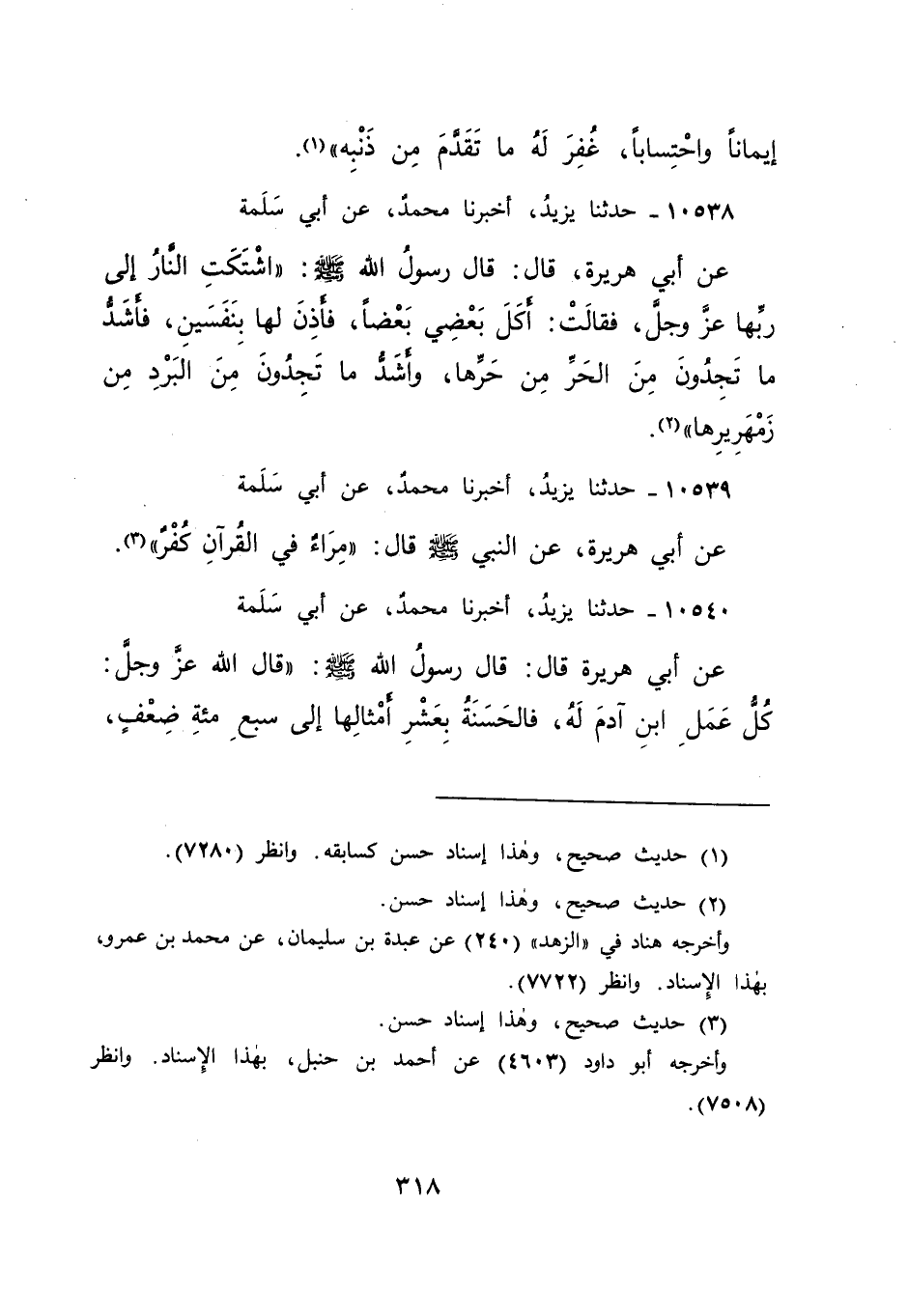 ١٠٥٣٨ - حَدَّثَنَا يَزِيدُ، أَخْبَرَنَا مُحَمَّدٌ، عَنْ أَبِي سَلَمَةَ، عَنْ أَبِي هُرَيْرَةَ، قَالَ: قَالَ رَسُولُ اللهِ صَلَّى اللهُ عَلَيْهِ وَسَلَّمَ: " اشْتَكَتِ النَّارُ إِلَى رَبِّهَا عَزَّ وَجَلَّ، فَقَالَتْ: أَكَلَ بَعْضِي بَعْضًا، فَأَذِنَ لَهَا بِنَفَسَيْنِ، فَأَشَدُّ مَا تَجِدُونَ مِنَ الْحَرِّ مِنْ حَرِّهَا، وَأَشَدُّ مَا تَجِدُونَ مِنَ الْبَرْدِ زَمْهَرِيرُهَا " (٢)