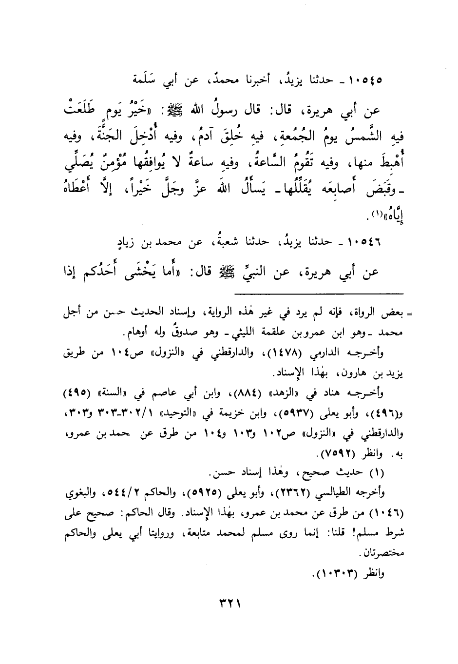 ١٠٥٤٥ - حَدَّثَنَا يَزِيدُ، أَخْبَرَنَا مُحَمَّدٌ، عَنْ أَبِي سَلَمَةَ، عَنْ أَبِي هُرَيْرَةَ، قَالَ: قَالَ رَسُولُ اللهِ صَلَّى اللهُ عَلَيْهِ وَسَلَّمَ: " خَيْرُ يَوْمٍ طَلَعَتْ فِيهِ الشَّمْسُ يَوْمُ الْجُمُعَةِ، فِيهِ خُلِقَ آدَمُ، وَفِيهِ أُدْخِلَ الْجَنَّةَ، وَفِيهِ أُهْبِطَ مِنْهَا، وَفِيهِ تَقُومُ السَّاعَةُ، وَفِيهِ سَاعَةٌ لَا يُوَافِقُهَا مُؤْمِنٌ يُصَلِّي - وَقَبَضَ أَصَابِعَهُ يُقَلِّلُهَا - يَسْأَلُ اللهَ عَزَّ وَجَلَّ خَيْرًا، إِلَّا أَعْطَاهُ إِيَّاهُ " (١)