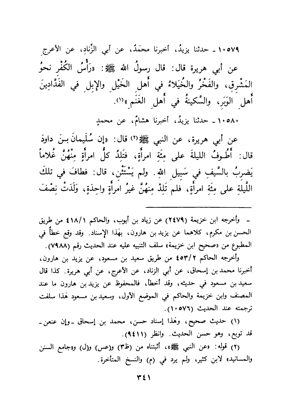 ١٠٥٨٠ - حَدَّثَنَا يَزِيدُ، أَخْبَرَنَا هِشَامٌ، عَنْ مُحَمَّدٍ، عَنْ أَبِي هُرَيْرَةَ عَنِ النَّبِيِّ صَلَّى اللهُ عَلَيْهِ وَسَلَّمَ (٢) ، قَالَ: " إِنَّ سُلَيْمَانَ بْنَ دَاوُدَ قَالَ: أَطُوفُ اللَّيْلَةَ عَلَى مِائَةِ امْرَأَةٍ، فَتَلِدُ كُلُّ امْرَأَةٍ مِنْهُنَّ غُلَامًا يَضْرِبُ بِالسَّيْفِ فِي سَبِيلِ اللهِ. وَلَمْ يَسْتَثْنِ، قَالَ: فَطَافَ فِي تِلْكَ اللَّيْلَةِ عَلَى مِائَةِ امْرَأَةٍ، فَلَمْ تَلِدْ مِنْهُنَّ غَيْرُ امْرَأَةٍ وَاحِدَةٍ، وَلَدَتْ نِصْفَ