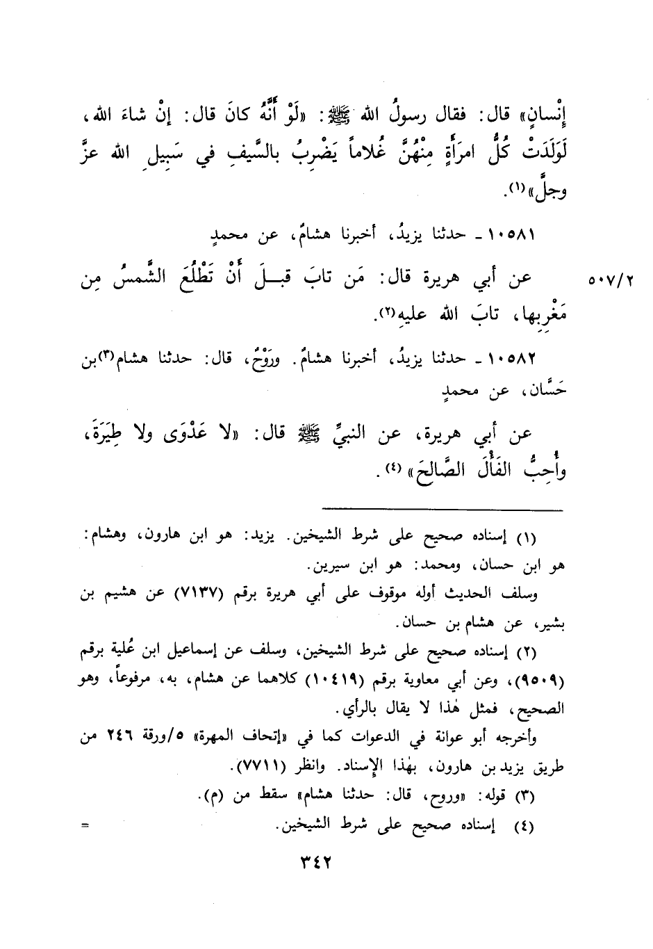 ١٠٥٨٢ - حَدَّثَنَا يَزِيدُ، أَخْبَرَنَا هِشَامٌ، وَرَوْحٌ قَالَ: حَدَّثَنَا هِشَامُ (٣) بْنُ حَسَّانَ، عَنْ مُحَمَّدٍ، عَنْ أَبِي هُرَيْرَةَ، عَنِ النَّبِيِّ صَلَّى اللهُ عَلَيْهِ وَسَلَّمَ قَالَ: " لَا عَدْوَى وَلَا طِيَرَةَ، وَأُحِبُّ الْفَأْلَ الصَّالِحَ " (٤)