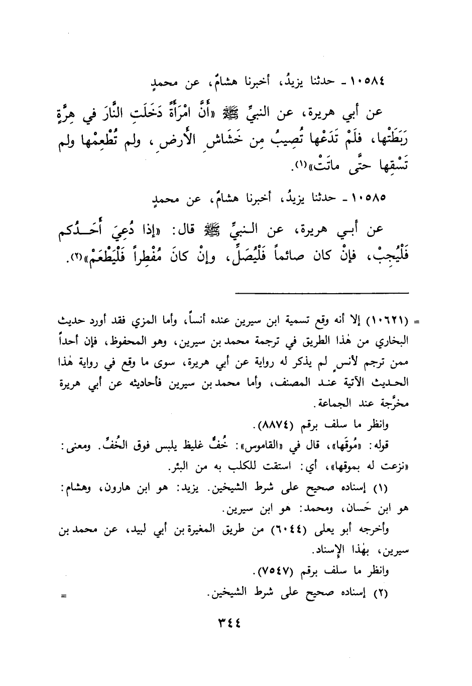 ١٠٥٨٤ - حَدَّثَنَا يَزِيدُ، أَخْبَرَنَا هِشَامٌ، عَنْ مُحَمَّدٍ، عَنْ أَبِي هُرَيْرَةَ، عَنِ النَّبِيِّ صَلَّى اللهُ عَلَيْهِ وَسَلَّمَ " أَنَّ امْرَأَةً دَخَلَتِ النَّارَ فِي هِرَّةٍ رَبَطَتْهَا، فَلَمْ تَدَعْهَا تُصِيبُ مِنْ خَشَاشِ الْأَرْضِ، وَلَمْ تُطْعِمْهَا وَلَمْ تَسْقِهَا حَتَّى مَاتَتْ " (١)