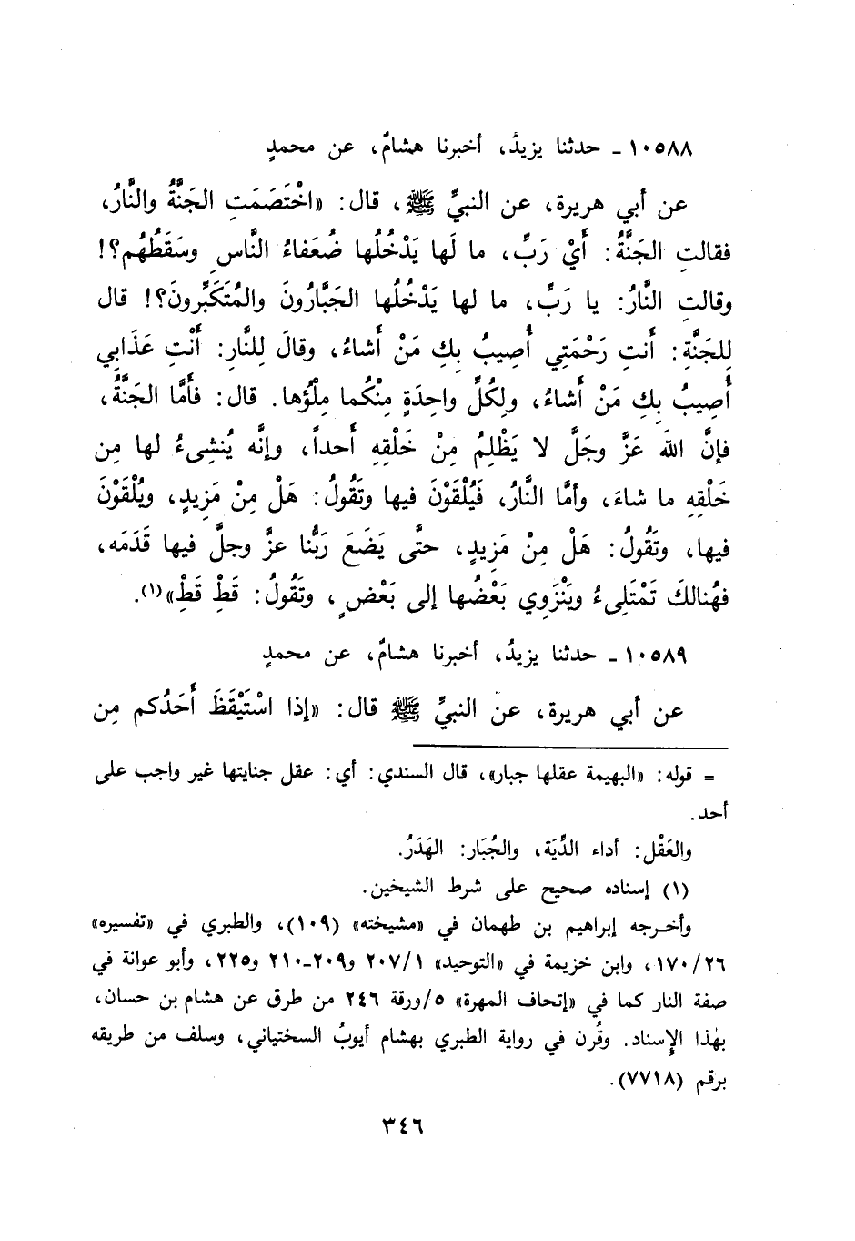 ١٠٥٨٨ - حَدَّثَنَا يَزِيدُ، أَخْبَرَنَا هِشَامٌ، عَنْ مُحَمَّدٍ، عَنْ أَبِي هُرَيْرَةَ، عَنِ النَّبِيِّ صَلَّى اللهُ عَلَيْهِ وَسَلَّمَ قَالَ: " اخْتَصَمَتِ الْجَنَّةُ وَالنَّارُ، فَقَالَتِ الْجَنَّةُ: أَيْ رَبِّ، مَا لَهَا يَدْخُلُهَا ضُعَفَاءُ النَّاسِ وَسَقَطُهُمْ؟ وَقَالَتِ النَّارُ: يَا رَبِّ، مَا لَهَا يَدْخُلُهَا الْجَبَّارُونَ وَالْمُتَكَبِّرُونَ؟ قَالَ لِلْجَنَّةِ: أَنْتِ رَحْمَتِي أُصِيبُ بِكِ مَنْ أَشَاءُ، وَقَالَ لِلنَّارِ: أَنْتِ عَذَابِي أُصِيبُ بِكِ مَنْ أَشَاءُ، وَلِكُلِّ وَاحِدَةٍ مِنْكُمَا مِلْؤُهَا. قَالَ: فَأَمَّا الْجَنَّةُ، فَإِنَّ اللهَ عَزَّ وَجَلَّ لَا يَظْلِمُ مِنْ خَلْقِهِ أَحَدًا، وَإِنَّهُ يُنْشِئُ لَهَا مِنْ خَلْقِهِ مَا شَاءَ، وَأَمَّا النَّارُ، فَيُلْقَوْنَ فِيهَا وَتَقُولُ: هَلْ مِنْ مَزِيدٍ، وَيُلْقَوْنَ فِيهَا، وَتَقُولُ: هَلْ مِنْ مَزِيدٍ، حَتَّى يَضَعَ رَبُّنَا عَزَّ وَجَلَّ فِيهَا قَدَمَهُ، فَهُنَالِكَ تَمْتَلِئُ وَيَنْزَوِي بَعْضُهَا إِلَى بَعْضٍ، وَتَقُولُ: قَطْ قَطْ " (١)