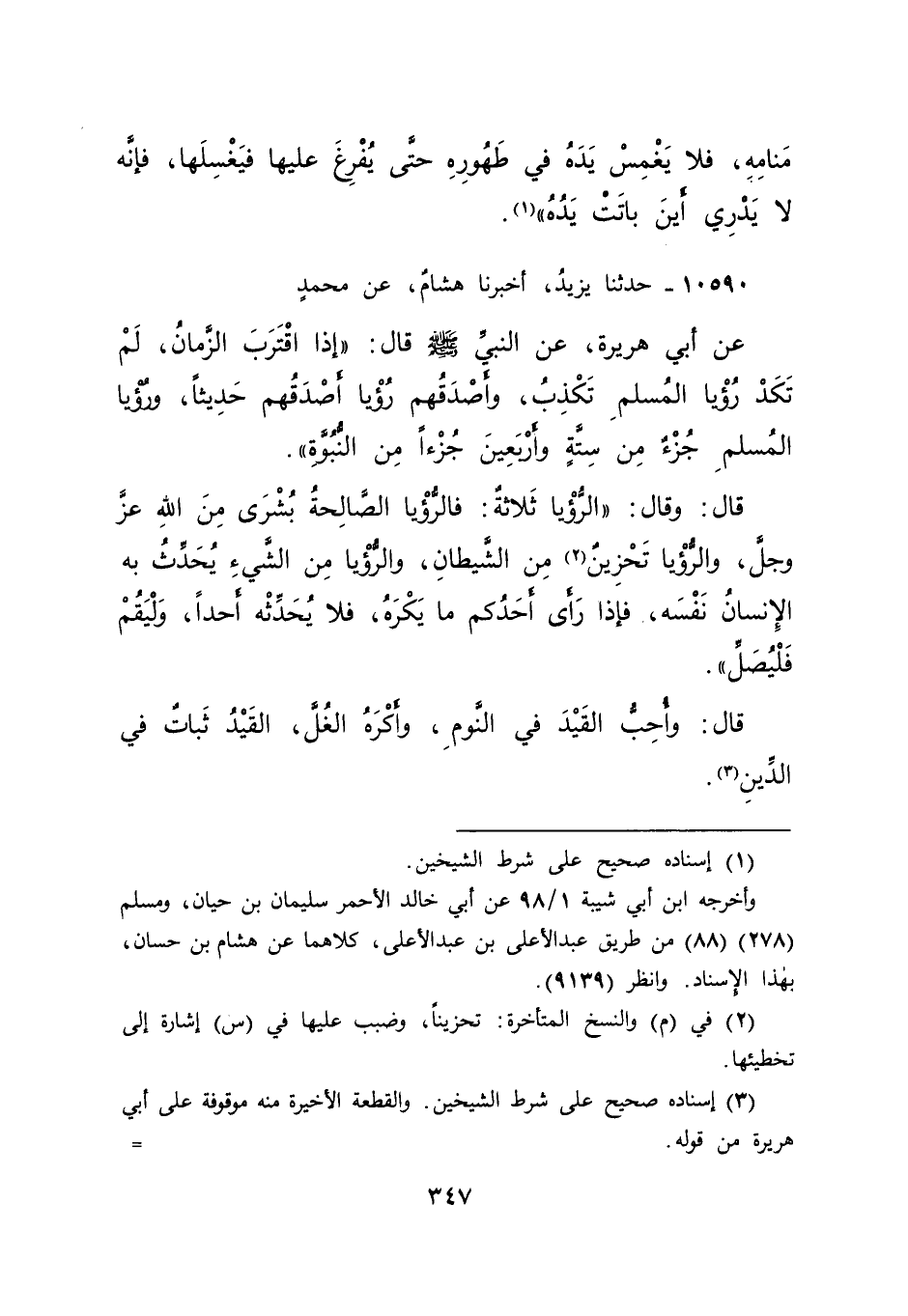 ١٠٥٩٠ - حَدَّثَنَا يَزِيدُ، أَخْبَرَنَا هِشَامٌ، عَنْ مُحَمَّدٍ، عَنْ أَبِي هُرَيْرَةَ، عَنِ النَّبِيِّ صَلَّى اللهُ عَلَيْهِ وَسَلَّمَ قَالَ: " إِذَا اقْتَرَبَ الزَّمَانُ، لَمْ تَكَدْ رُؤْيَا الْمُسْلِمِ تَكْذِبُ، وَأَصْدَقُهُمْ رُؤْيَا أَصْدَقُهُمْ حَدِيثًا، وَرُؤْيَا الْمُسْلِمِ جُزْءٌ مِنْ سِتَّةٍ وَأَرْبَعِينَ جُزْءًا مِنَ النُّبُوَّةِ " قَالَ: وَقَالَ: " الرُّؤْيَا ثَلَاثَةٌ: فَالرُّؤْيَا الصَّالِحَةُ بُشْرَى مِنَ اللهِ عَزَّ وَجَلَّ، وَالرُّؤْيَا تَحْزِينٌ (٢) مِنَ الشَّيْطَانِ، وَالرُّؤْيَا مِنَ الشَّيْءِ يُحَدِّثُ بِهِ الْإِنْسَانُ نَفْسَهُ، فَإِذَا رَأَى أَحَدُكُمْ مَا يَكْرَهُ، فَلَا يُحَدِّثْهُ أَحَدًا، وَلْيَقُمْ فَلْيُصَلِّ " قَالَ: وَأُحِبُّ الْقَيْدَ فِي النَّوْمِ وَأَكْرَهُ الْغُلَّ الْقَيْدُ ثَبَاتٌ فِي الدِّينِ (٣)