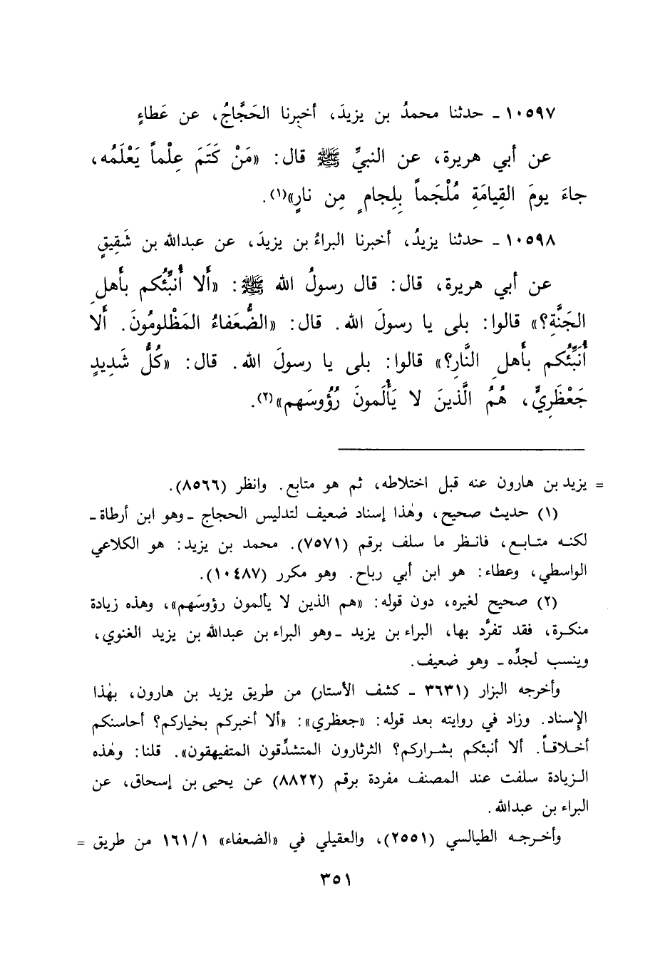 ١٠٥٩٧ - حَدَّثَنَا مُحَمَّدُ بْنُ يَزِيدَ، أَخْبَرَنَا الْحَجَّاجُ، عَنْ عَطَاءٍ، عَنْ أَبِي هُرَيْرَةَ، عَنِ النَّبِيِّ صَلَّى اللهُ عَلَيْهِ وَسَلَّمَ: قَالَ: " مَنْ كَتَمَ عِلْمًا يَعْلَمُهُ، جَاءَ يَوْمَ الْقِيَامَةِ مُلَجَّمًا بِلِجَامٍ مِنْ نَارٍ " (١)