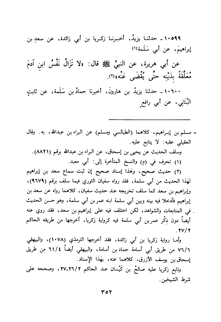 ١٠٥٩٩ - حَدَّثَنَا يَزِيدُ، أَخْبَرَنَا زَكَرِيَّا بْنُ أَبِي زَائِدَةَ، عَنْ سَعْدِ بْنِ إِبْرَاهِيمَ، عَنْ أَبِي سَلَمَةَ (١) ، عَنْ أَبِي هُرَيْرَةَ، عَنِ النَّبِيِّ صَلَّى اللهُ عَلَيْهِ وَسَلَّمَ قَالَ: " لَا تَزَالُ نَفْسُ ابْنِ آدَمَ مُعَلَّقَةً بِدَيْنِهِ حَتَّى يُقْضَى عَنْهُ " (٢)