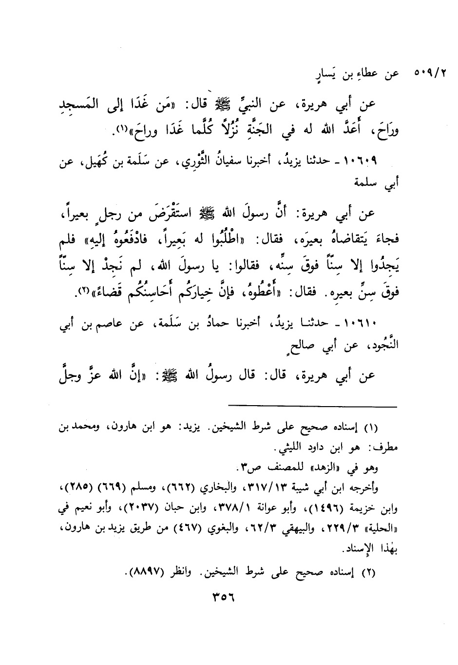 ١٠٦٠٩ - حَدَّثَنَا يَزِيدُ، أَخْبَرَنَا سُفْيَانُ الثَّوْرِيُّ، عَنْ سَلَمَةَ بْنِ كُهَيْلٍ، عَنْ أَبِي سَلَمَةَ، عَنْ أَبِي هُرَيْرَةَ، أَنَّ رَسُولَ اللهِ صَلَّى اللهُ عَلَيْهِ وَسَلَّمَ اسْتَقْرَضَ مِنْ رَجُلٍ بَعِيرًا، فَجَاءَ يَتَقَاضَاهُ بَعِيرَهُ، فَقَالَ: " اطْلُبُوا لَهُ بَعِيرًا، فَادْفَعُوهُ إِلَيْهِ " فَلَمْ يَجِدُوا إِلَّا سِنًّا فَوْقَ سِنِّهِ، فَقَالُوا: يَا رَسُولَ اللهِ، لَمْ نَجِدْ إِلَّا سِنًّا فَوْقَ سِنِّ بَعِيرِهِ. فَقَالَ: " أَعْطُوهُ، فَإِنَّ خِيَارَكُمْ أَحَاسِنُكُمْ قَضَاءً " (٢)