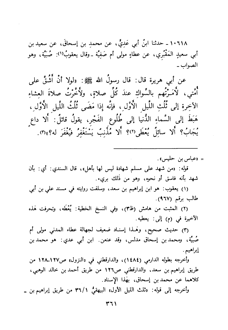١٠٦١٨ - حَدَّثَنَا ابْنُ أَبِي عَدِيٍّ، عَنْ مُحَمَّدِ بْنِ إِسْحَاقَ، عَنْ سَعِيدِ بْنِ أَبِي سَعِيدٍ الْمَقْبُرِيِّ، عَنْ عَطَاءٍ، مَوْلَى أُمِّ صَفِيَّةَ وَقَالَ: يَعْقُوبُ (١) صُبَيَّةَ وَهُوَ الصَّوَابُ عَنْ أَبِي هُرَيْرَةَ، قَالَ: قَالَ رَسُولُ اللهِ صَلَّى اللهُ عَلَيْهِ وَسَلَّمَ: " لَوْلَا أَنْ أَشُقَّ عَلَى أُمَّتِي، لَأَمَرْتُهُمْ بِالسِّوَاكِ عِنْدَ كُلِّ صَلَاةٍ، وَلَأَخَّرْتُ صَلَاةَ الْعِشَاءِ الْآخِرَةِ إِلَى ثُلُثِ اللَّيْلِ الْأَوَّلِ، فَإِنَّهُ إِذَا مَضَى ثُلُثُ اللَّيْلِ الْأَوَّلُ، هَبَطَ إِلَى السَّمَاءِ الدُّنْيَا إِلَى طُلُوعِ الْفَجْرِ، يَقُولُ قَائِلٌ: أَلَا دَاعٍ يُجَابُ؟ أَلَا سَائِلٌ يُعْطَي (٢) ؟ أَلَا مُذْنِبٌ يَسْتَغْفِرُ فَيُغْفَرَ لَهُ؟ " (٣)