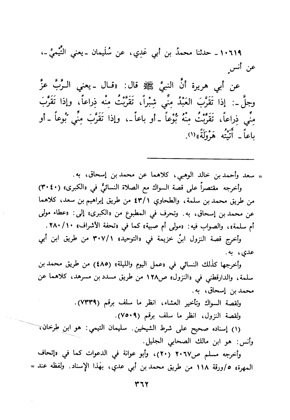 ١٠٦١٩ - حَدَّثَنَا مُحَمَّدُ بْنُ أَبِي عَدِيٍّ، عَنْ سُلَيْمَانَ يَعْنِي التَّيْمِيَّ، عَنْ أَنَسٍ، عَنْ أَبِي هُرَيْرَةَ، أَنَّ النَّبِيَّ صَلَّى اللهُ عَلَيْهِ وَسَلَّمَ قَالَ: يَعْنِي الرَّبَّ عَزَّ وَجَلَّ: " إِذَا تَقَرَّبَ الْعَبْدُ مِنِّي شِبْرًا، تَقَرَّبْتُ مِنْهُ ذِرَاعًا، وَإِذَا تَقَرَّبَ مِنِّي ذِرَاعًا، تَقَرَّبْتُ مِنْهُ بُوعًا - أَوْ بَاعًا - وَإِذَا تَقَرَّبَ مِنِّي بُوعًا - أَوْ بَاعًا - أَتَيْتُهُ هَرْوَلَةً " (١)