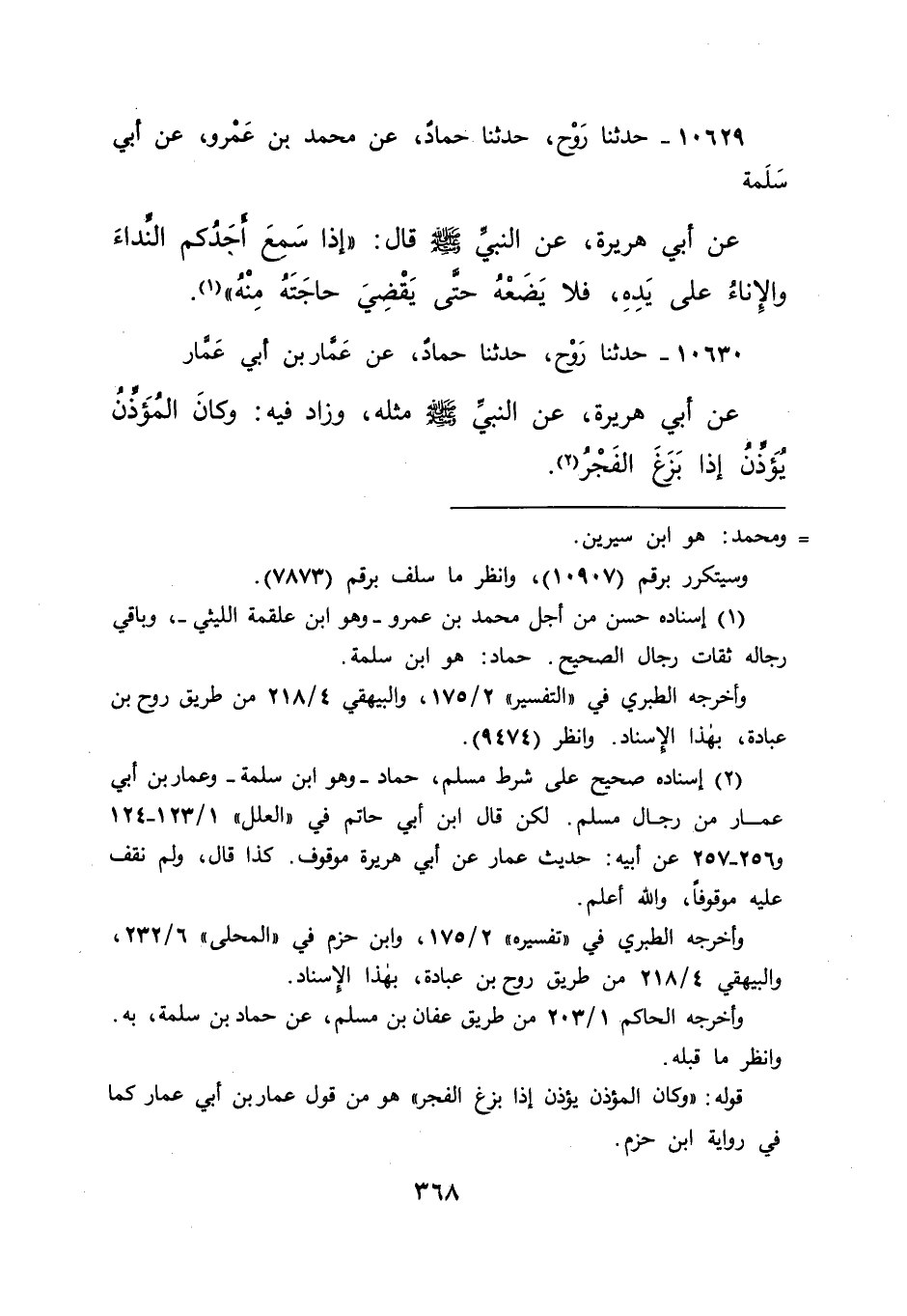 ١٠٦٣٠ - حَدَّثَنَا رَوْحٌ، حَدَّثَنَا حَمَّادٌ، عَنْ عَمَّارِ بْنِ أَبِي عَمَّارٍ، عَنْ أَبِي هُرَيْرَةَ، عَنِ النَّبِيِّ صَلَّى اللهُ عَلَيْهِ وَسَلَّمَ مِثْلَهُ وَزَادَ فِيهِ: وَكَانَ الْمُؤَذِّنُ يُؤَذِّنُ إِذَا بَزَغَ الْفَجْرُ (٢)