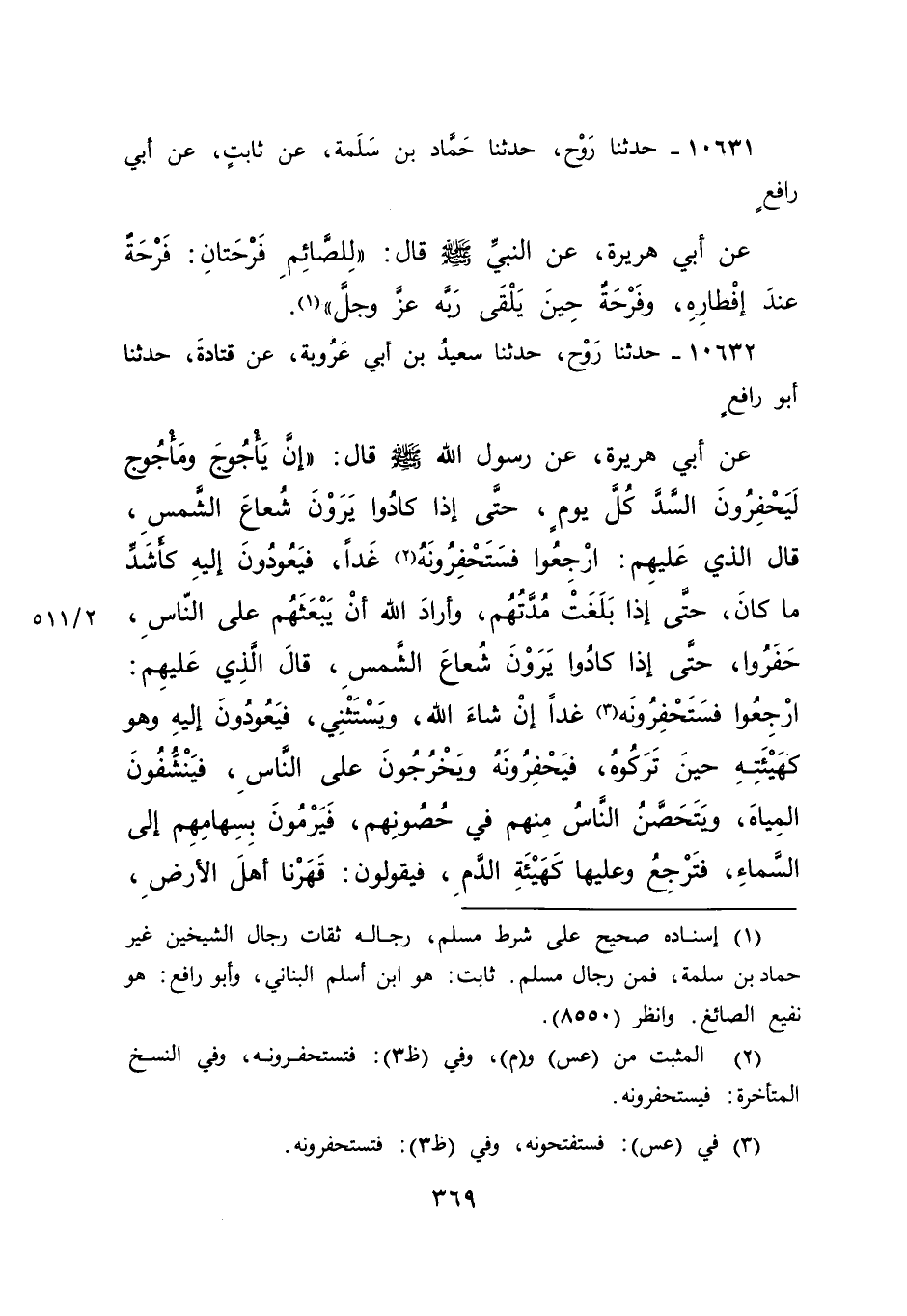 ١٠٦٣٢ - حَدَّثَنَا رَوْحٌ، حَدَّثَنَا سَعِيدُ بْنُ أَبِي عَرُوبَةَ، عَنْ قَتَادَةَ، حَدَّثَنَا أَبُو رَافِعٍ، عَنْ أَبِي هُرَيْرَةَ، عَنْ رَسُولِ اللهِ صَلَّى اللهُ عَلَيْهِ وَسَلَّمَ قَالَ: " إِنَّ يَأْجُوجَ وَمَأْجُوجَ لَيَحْفِرُونَ السَّدَّ كُلَّ يَوْمٍ، حَتَّى إِذَا كَادُوا يَرَوْنَ شُعَاعَ الشَّمْسِ، قَالَ الَّذِي عَلَيْهِمْ: ارْجِعُوا فَسَتَحْفِرُونَهُ (٢) غَدًا، فَيَعُودُونَ إِلَيْهِ كَأَشَدِّ مَا كَانَ، حَتَّى إِذَا بَلَغَتْ مُدَّتُهُمْ، وَأَرَادَ اللهُ أَنْ يَبْعَثَهُمْ عَلَى النَّاسِ، حَفَرُوا، حَتَّى إِذَا كَادُوا يَرَوْنَ شُعَاعَ الشَّمْسِ، قَالَ الَّذِي عَلَيْهِمْ: ارْجِعُوا فَسَتَحْفِرُونَهُ (٣) غَدًا، إِنْ شَاءَ اللهُ، وَيَسْتَثْنِي، فَيَعُودُونَ إِلَيْهِ وَهُوَ كَهَيْئَتِهِ حِينَ تَرَكُوهُ، فَيَحْفِرُونَهُ وَيَخْرُجُونَ عَلَى النَّاسِ، فَيُنَشِّفُونَ الْمِيَاهَ، وَيَتَحَصَّنَ النَّاسُ مِنْهُمْ فِي حُصُونِهِمْ، فَيَرْمُونَ بِسِهَامِهِمْ إِلَى السَّمَاءِ، فَتَرْجِعُ وَعَلَيْهَا كَهَيْئَةِ الدَّمِ، فَيَقُولُونَ: قَهَرْنَا أَهْلَ الْأَرْضِ،