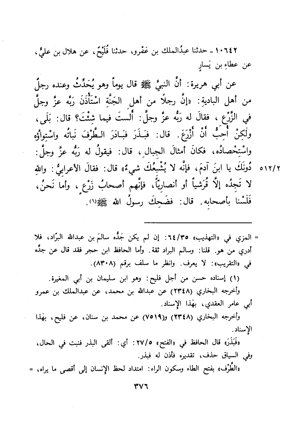 ١٠٦٤٢ - حَدَّثَنَا عَبْدُ الْمَلِكِ بْنُ عَمْرٍو، حَدَّثَنَا فُلَيْحٌ، عَنْ هِلَالِ بْنِ عَلِيٍّ، عَنْ عَطَاءِ بْنِ يَسَارٍ، عَنْ أَبِي هُرَيْرَةَ، أَنَّ النَّبِيَّ صَلَّى اللهُ عَلَيْهِ وَسَلَّمَ قَالَ: يَوْمًا وَهُوَ يُحَدِّثُ وَعِنْدَهُ رَجُلٌ مِنْ أَهْلِ الْبَادِيَةِ: " إِنَّ رَجُلًا مِنْ أَهْلِ الْجَنَّةِ اسْتَأْذَنَ رَبَّهُ عَزَّ وَجَلَّ فِي الزَّرْعِ، فَقَالَ لَهُ رَبُّهُ عَزَّ وَجَلَّ: أَلَسْتَ فِيمَا شِئْتَ؟ قَالَ: بَلَى، وَلَكِنْ أُحِبُّ أَنْ أَزْرَعَ. قَالَ: فَبَذَرَ فَبَادَرَ الطَّرْفَ نَبَاتُهُ وَاسْتِوَاؤُهُ وَاسْتِحْصَادُهُ، فَكَانَ أَمْثَالَ الْجِبَالِ، قَالَ: فَيَقُولُ لَهُ رَبُّهُ عَزَّ وَجَلَّ: دُونَكَ يَا ابْنَ آدَمَ، فَإِنَّهُ لَا يُشْبِعُكَ شَيْءٌ " قَالَ: فَقَالَ الْأَعْرَابِيُّ: وَاللهِ لَا تَجِدُهُ إِلَّا قُرَشِيًّا أَوْ أَنْصَارِيًّا، فَإِنَّهُمْ أَصْحَابُ زَرْعٍ وَأَمَّا نَحْنُ، فَلَسْنَا بِأَصْحَابِهِ. قَالَ: فَضَحِكَ رَسُولُ اللهِ صَلَّى اللهُ عَلَيْهِ وَسَلَّمَ (١)