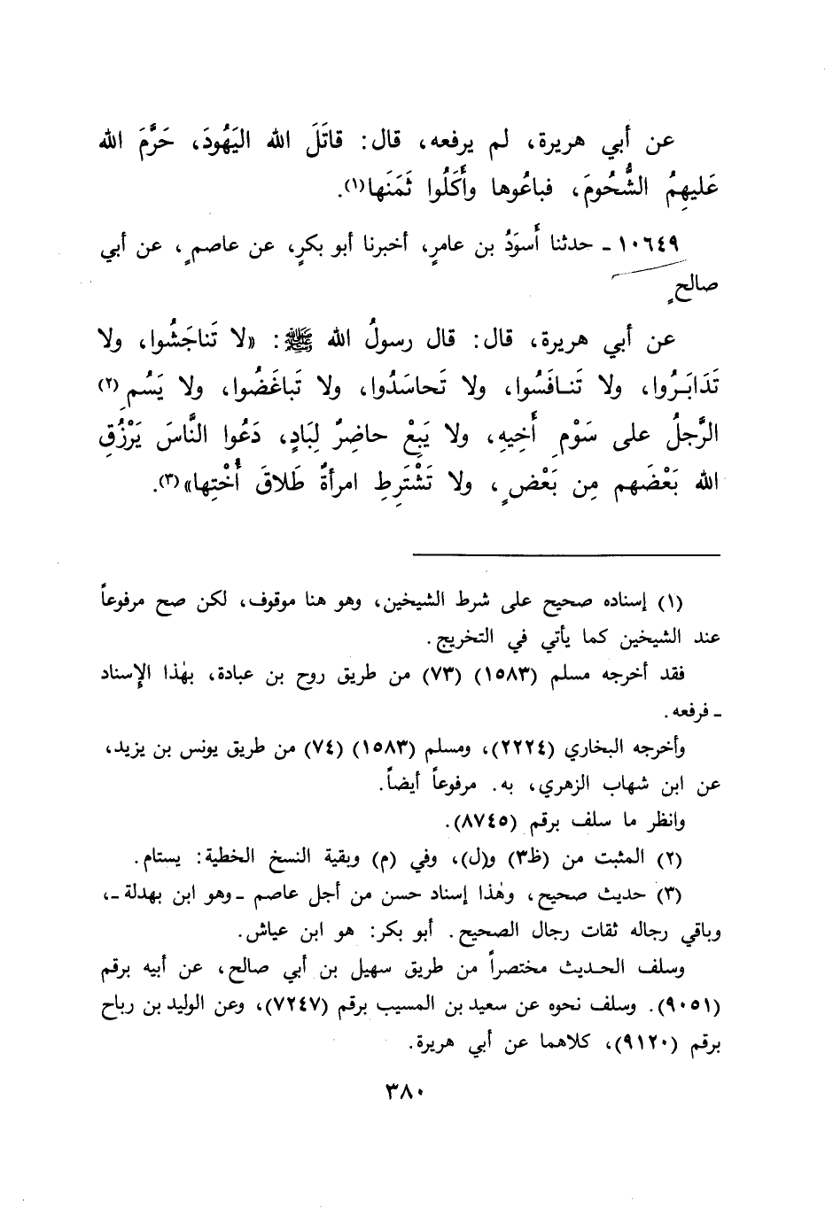 ١٠٦٤٩ - حَدَّثَنَا أَسْوَدُ بْنُ عَامِرٍ، أَخْبَرَنَا أَبُو بَكْرٍ، عَنْ عَاصِمٍ، عَنْ أَبِي صَالِحٍ، عَنْ أَبِي هُرَيْرَةَ، قَالَ: قَالَ رَسُولُ اللهِ صَلَّى اللهُ عَلَيْهِ وَسَلَّمَ: " لَا تَنَاجَشُوا، وَلَا تَدَابَرُوا، وَلَا تَنَافَسُوا، وَلَا تَحَاسَدُوا، وَلَا تَبَاغَضُوا، وَلَا يَسُمِ (٢) الرَّجُلُ عَلَى سَوْمِ أَخِيهِ، وَلَا يَبِعْ حَاضِرٌ لِبَادٍ، دَعُوا النَّاسَ يَرْزُقُ اللهُ بَعْضَهُمْ مِنْ بَعْضٍ، وَلَا تَشْتَرِطْ امْرَأَةٌ طَلَاقَ أُخْتِهَا " (٣)