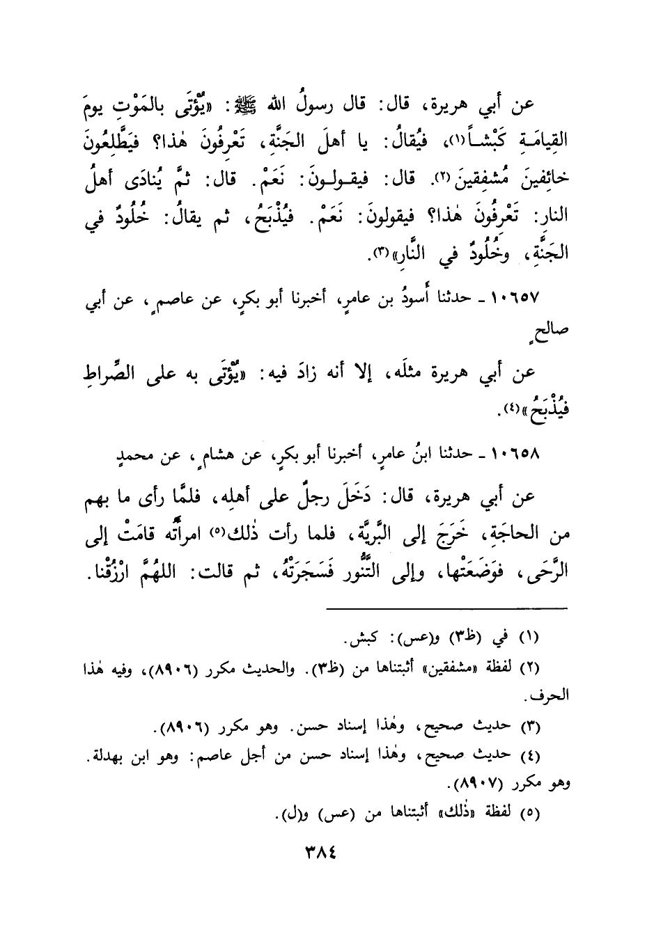 ١٠٦٥٧ - حَدَّثَنَا أَسْوَدُ بْنُ عَامِرٍ، أَخْبَرَنَا أَبُو بَكْرٍ، عَنْ عَاصِمٍ، عَنْ أَبِي صَالِحٍ، عَنْ أَبِي هُرَيْرَةَ مِثْلَهُ إِلَّا أَنَّهُ زَادَ فِيهِ " يُؤْتَى عَلَى الصِّرَاطِ فَيُذْبَحُ " (٤)