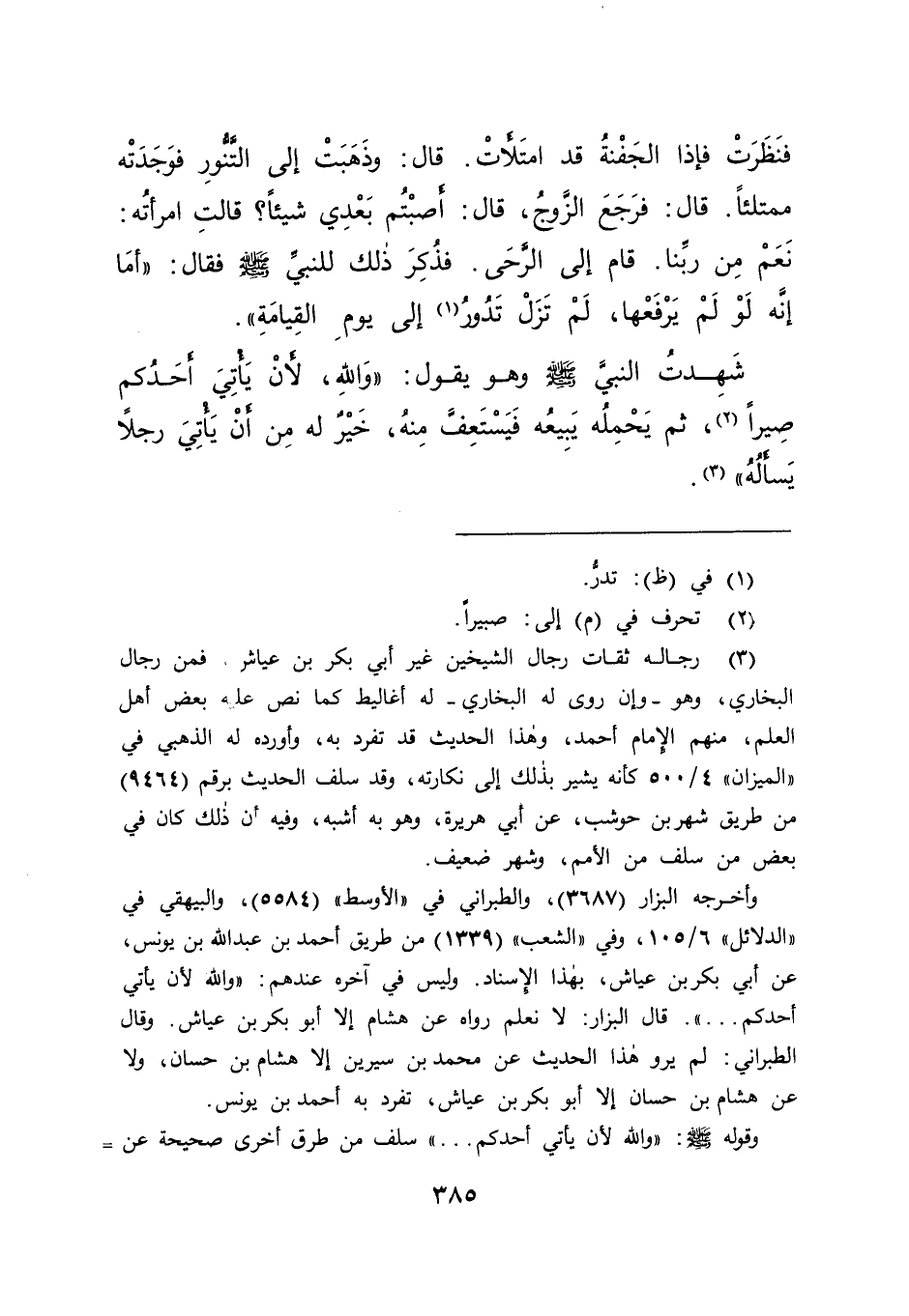 وأخرجه البزار (٣٦٨٧) ، والطبراني في "الأوسط" (٥٥٨٤) ، والبيهقى في "الدلائل" ٦/١٠٥، وفي "الشعب" (١٣٣٩) من طريق أحمد بن عبد الله بن يونس، عن أبي بكر بن عياش، بهذا الإسناد. وليس في آخره عندهم: "والله لأن ياتي أحدكم ... ". قال البزار: لا نعلم رواه عن هشام إلا أبو بكر بن عياش. وقال الطبراني: لم يرو هذا الحديث عن محمد بن سيرين إلا هشام بن حسان، ولا عن هشام بن حسان إلا أبو بكر بن عياش، تفرد به أحمد بن يونس.
