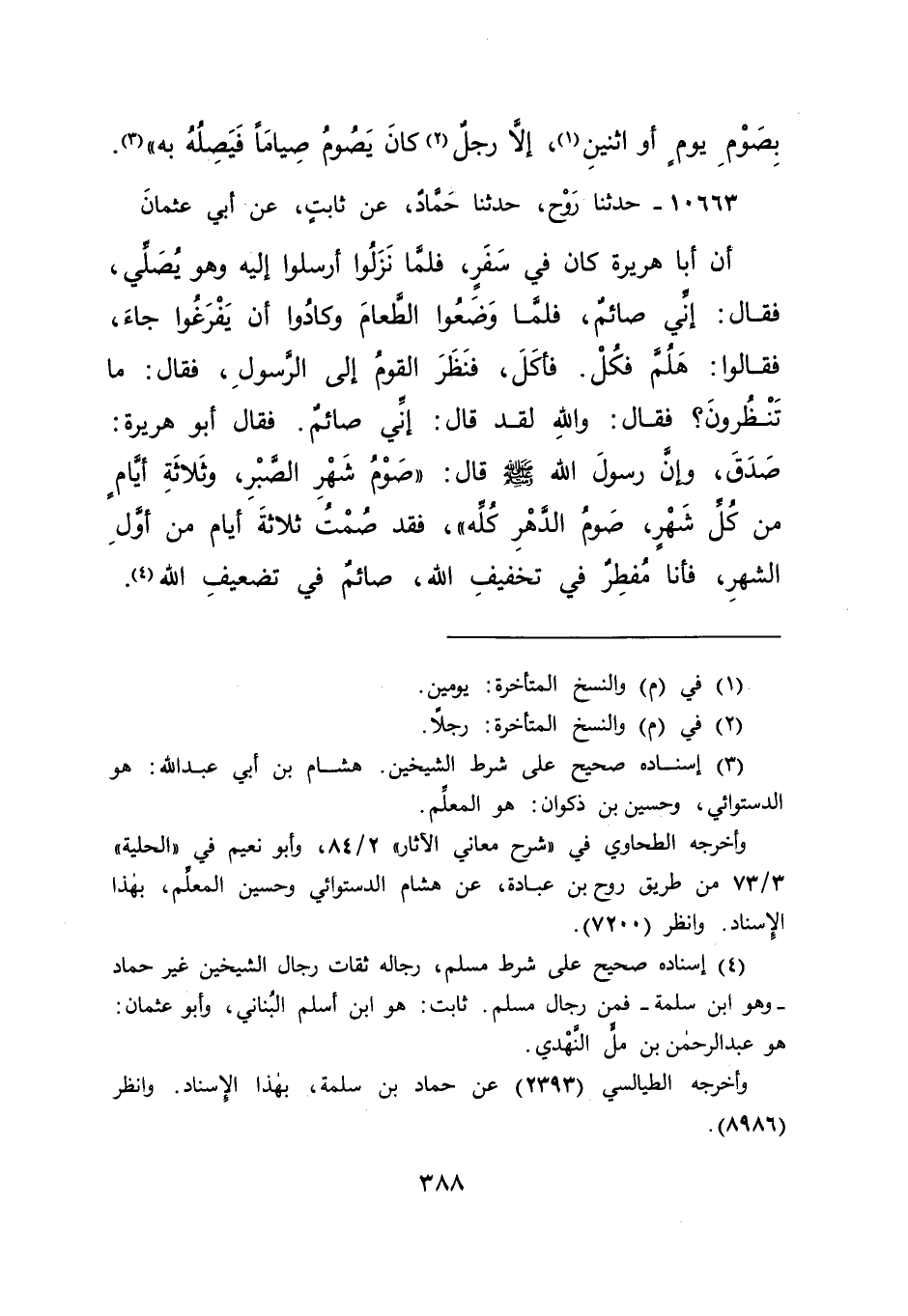 ١٠٦٦٣ - حَدَّثَنَا رَوْحٌ، حَدَّثَنَا حَمَّادٌ، عَنْ ثَابِتٍ، عَنْ أَبِي عُثْمَانَ، أَنَّ أَبَا هُرَيْرَةَ، كَانَ فِي سَفَرٍ، فَلَمَّا نَزَلُوا أَرْسَلُوا إِلَيْهِ وَهُوَ يُصَلِّي، فَقَالَ: إِنِّي صَائِمٌ، فَلَمَّا وَضَعُوا الطَّعَامَ وَكَادُوا أَنْ يَفْرَغُوا جَاءَ، فَقَالُوا: هَلُمَّ فَكُلْ. فَأَكَلَ، فَنَظَرَ الْقَوْمُ إِلَى الرَّسُولِ، فَقَالَ: مَا تَنْظُرُونَ؟ فَقَالَ: وَاللهِ لَقَدْ قَالَ: إِنِّي صَائِمٌ. فَقَالَ أَبُو هُرَيْرَةَ: صَدَقَ وَإِنَّ رَسُولَ اللهِ صَلَّى اللهُ عَلَيْهِ وَسَلَّمَ قَالَ: " صَوْمُ شَهْرِ الصَّبْرِ، وَثَلَاثَةُ أَيَّامٍ مِنْ كُلِّ شَهْرٍ، صَوْمُ الدَّهْرِ كُلِّهِ " فَقَدْ صُمْتُ ثَلَاثَةَ أَيَّامٍ مِنْ أَوَّلِ الشَّهْرِ، فَأَنَا مُفْطِرٌ فِي تَخْفِيفِ اللهِ، صَائِمٌ فِي تَضْعِيفِ اللهِ (٤)