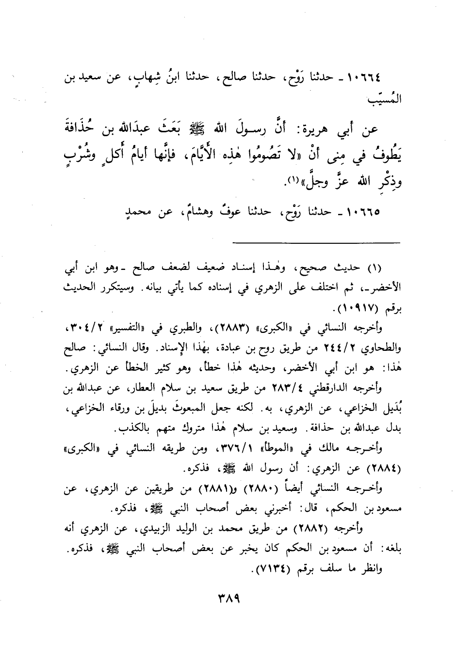 ١٠٦٦٤ - حَدَّثَنَا رَوْحٌ، حَدَّثَنَا صَالِحٌ، حَدَّثَنَا ابْنُ شِهَابٍ، عَنْ سَعِيدِ بْنِ الْمُسَيِّبِ، عَنْ أَبِي هُرَيْرَةَ، أَنَّ رَسُولَ اللهِ صَلَّى اللهُ عَلَيْهِ وَسَلَّمَ بَعَثَ عَبْدَ اللهِ بْنَ حُذَافَةَ يَطُوفُ فِي مِنًى أَنْ " لَا تَصُومُوا هَذِهِ الْأَيَّامَ، فَإِنَّهَا أَيَّامُ أَكْلٍ وَشُرْبٍ وَذِكْرِ اللهِ عَزَّ وَجَلَّ " (١)
