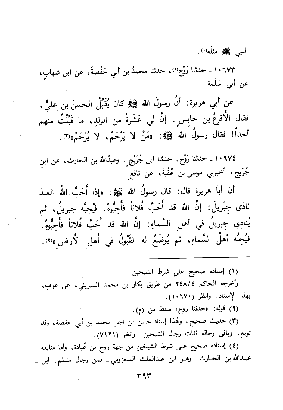 ١٠٦٧٣ - حَدَّثَنَا رَوْحٌ (٢) ، حَدَّثَنَا مُحَمَّدُ بْنُ أَبِي حَفْصَةَ، عَنِ ابْنِ شِهَابٍ، عَنْ أَبِي سَلَمَةَ، عَنْ أَبِي هُرَيْرَةَ، أَنَّ رَسُولَ اللهِ صَلَّى اللهُ عَلَيْهِ وَسَلَّمَ كَانَ يُقَبِّلُ الْحَسَنَ بْنَ عَلِيٍّ، فَقَالَ: الْأَقْرَعُ بْنُ حَابِسٍ: إِنَّ لِي عَشَرَةً مِنَ الْوَلَدِ، مَا قَبَّلْتُ مِنْهُمْ أَحَدًا فَقَالَ رَسُولُ اللهِ صَلَّى اللهُ عَلَيْهِ وَسَلَّمَ: " مَنْ لَا يَرْحَمُ، لَا يُرْحَمُ " (٣)