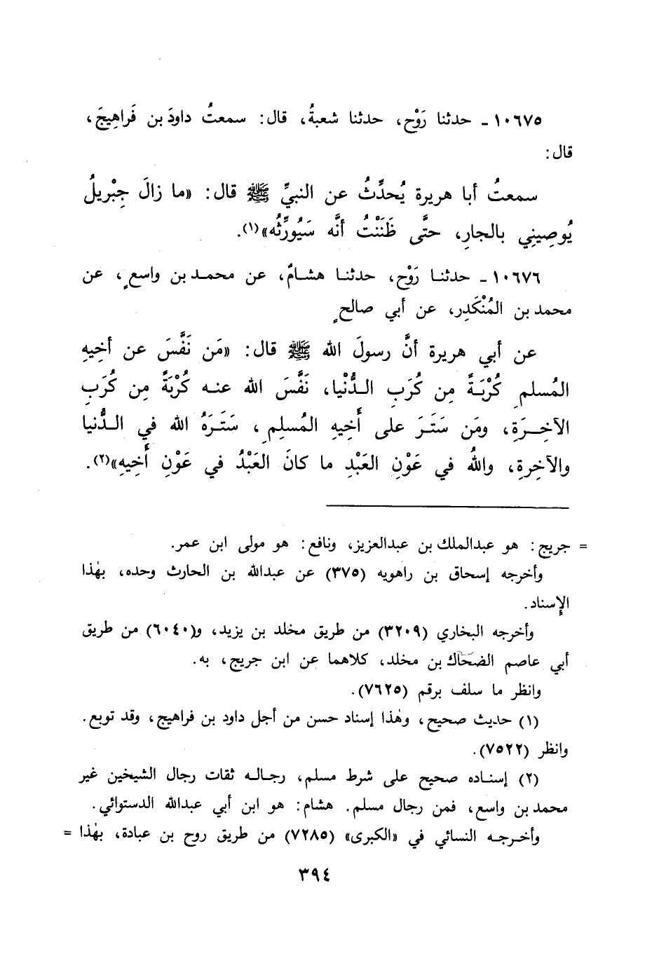 ١٠٦٧٦ - حَدَّثَنَا رَوْحٌ، حَدَّثَنَا هِشَامٌ، عَنْ مُحَمَّدِ بْنِ وَاسِعٍ، عَنْ مُحَمَّدِ بْنِ الْمُنْكَدِرِ، عَنْ أَبِي صَالِحٍ، عَنْ أَبِي هُرَيْرَةَ، أَنَّ رَسُولَ اللهِ صَلَّى اللهُ عَلَيْهِ وَسَلَّمَ قَالَ: " مَنْ نَفَّسَ عَنْ أَخِيهِ الْمُسْلِمِ كُرْبَةً مِنْ كُرَبِ الدُّنْيَا، نَفَّسَ اللهُ عَنْهُ كُرْبَةً مِنْ كُرَبِ الْآخِرَةِ، وَمَنْ سَتَرَ عَلَى أَخِيهِ الْمُسْلِمِ، سَتَرَهُ اللهُ فِي الدُّنْيَا وَالْآخِرَةِ، وَاللهُ فِي عَوْنِ الْعَبْدِ مَا كَانَ الْعَبْدُ فِي عَوْنِ أَخِيهِ " (٢)