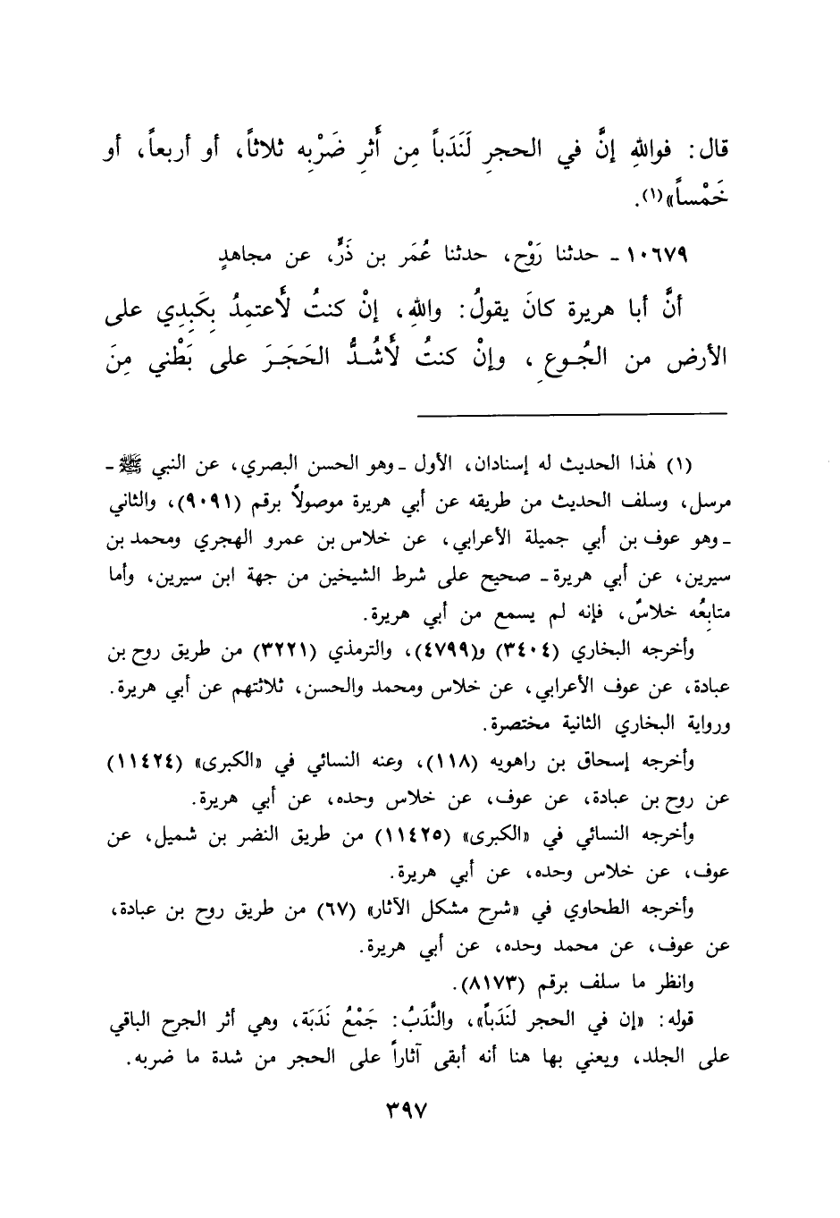 ١٠٦٧٩ - حَدَّثَنَا رَوْحٌ، حَدَّثَنَا عُمَرُ بْنُ ذَرٍّ، عَنْ مُجَاهِدٍ، أَنَّ أَبَا هُرَيْرَةَ، كَانَ يَقُولُ: وَاللهِ إِنْ كُنْتُ لَأَعْتَمِدُ بِكَبِدِي عَلَى الْأَرْضِ مِنَ الْجُوعِ، وَإِنْ كُنْتُ لَأَشُدُّ الْحَجَرَ عَلَى بَطْنِي