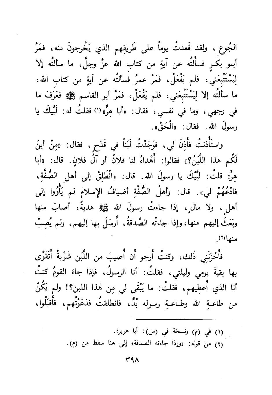 مِنَ الْجُوعِ، وَلَقَدْ قَعَدْتُ يَوْمًا عَلَى طَرِيقِهِمُ الَّذِي يَخْرُجُونَ مِنْهُ، فَمَرَّ أَبُو بَكْرٍ فَسَأَلْتُهُ عَنْ آيَةٍ مِنْ كِتَابِ اللهِ عَزَّ وَجَلَّ، مَا سَأَلْتُهُ إِلَّا لِيَسْتَتْبِعَنِي، فَلَمْ يَفْعَلْ، فَمَرَّ عُمَرُ فَسَأَلْتُهُ عَنْ آيَةٍ مِنْ كِتَابِ اللهِ، مَا سَأَلْتُهُ إِلَّا لِيَسْتَتْبِعَنِي، فَلَمْ يَفْعَلْ، فَمَرَّ أَبُو الْقَاسِمِ صَلَّى اللهُ عَلَيْهِ وَسَلَّمَ فَعَرَفَ مَا فِي وَجْهِي، وَمَا فِي نَفْسِي، فَقَالَ: " أَبَا هِرٍّ " (١) فَقُلْتُ لَهُ: لَبَّيْكَ يَا رَسُولَ اللهِ. فَقَالَ: " الْحَقْ " وَاسْتَأْذَنْتُ فَأَذِنَ لِي، فَوَجَدْتُ لَبَنًا فِي قَدَحٍ، فَقَالَ: " مِنْ أَيْنَ لَكُمْ هَذَا اللَّبَنُ؟ " فَقَالُوا: أَهْدَاهُ لَنَا فُلَانٌ أَوْ آلُ فُلَانٍ. قَالَ: " أَبَا هِرٍّ " قُلْتُ: لَبَّيْكَ يَا رَسُولَ اللهِ. قَالَ: " انْطَلِقْ إِلَى أَهْلِ الصُّفَّةِ، فَادْعُهُمْ لِي " قَالَ: وَأَهْلُ الصُّفَّةِ أَضْيَافُ الْإِسْلَامِ لَمْ يَأْوُوا إِلَى أَهْلٍ، وَلَا مَالٍ، إِذَا جَاءَتْ رَسُولَ اللهِ صَلَّى اللهُ عَلَيْهِ وَسَلَّمَ هَدِيَّةٌ، أَصَابَ مِنْهَا وَبَعَثَ إِلَيْهِمْ مِنْهَا، وَإِذَا جَاءَتْهُ الصَّدَقَةُ أَرْسَلَ بِهَا إِلَيْهِمْ وَلَمْ يُصِبْ مِنْهَا (٢) فَأَحْزَنَنِي ذَلِكَ وَكُنْتُ أَرْجُو أَنْ أُصِيبَ مِنَ اللَّبَنِ شَرْبَةً أَتَقَوَّى بِهَا بَقِيَّةَ يَوْمِي وَلَيْلَتِي. فَقُلْتُ: أَنَا الرَّسُولُ، فَإِذَا جَاءَ الْقَوْمُ كُنْتُ أَنَا الَّذِي أُعْطِيهِمْ، فَقُلْتُ: مَا يَبْقَى لِي مِنْ هَذَا اللَّبَنِ؟ وَلَمْ يَكُنْ مِنْ طَاعَةِ اللهِ وَطَاعَةِ رَسُولِهِ بُدٌّ، فَانْطَلَقْتُ فَدَعَوْتُهُمْ، فَأَقْبَلُوا،
